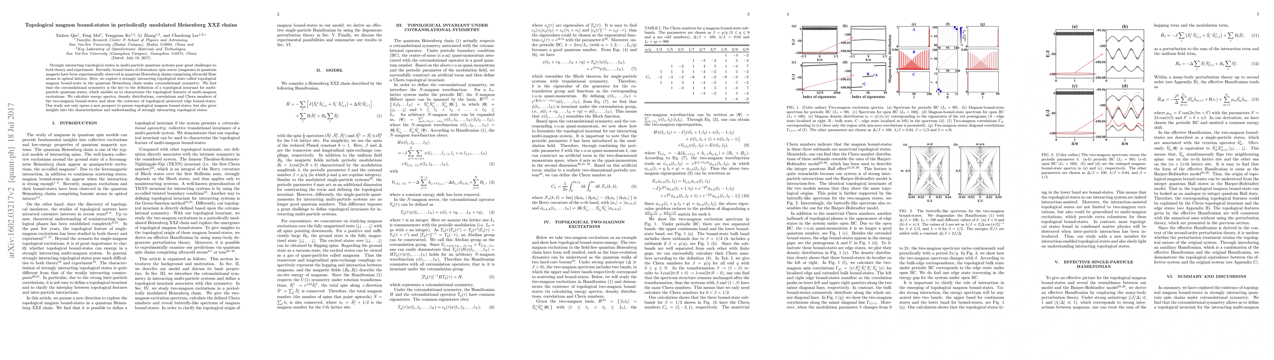 This paper investigates topological magnon bound-states in periodically modulated Heisenberg XXZ chains, revealing that cotranslational symmetry defines a topological invariant for multi-particle states. The study demonstrates the existence of topologically protected edge bound-states, offering new insights into the characterization of strongly interacting topological states in quantum magnets.
