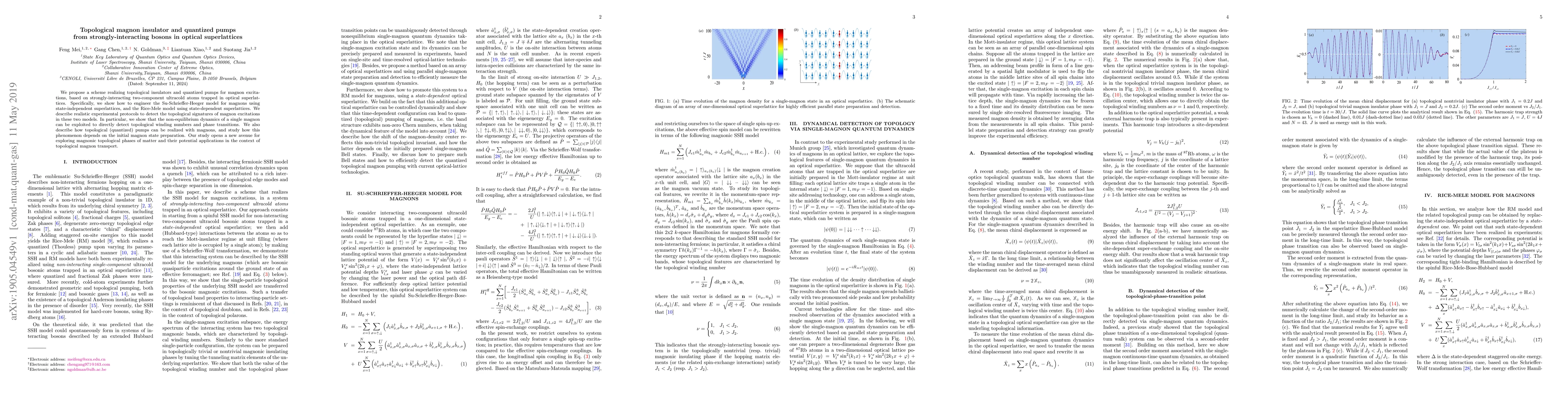 This paper proposes a method to create topological magnon insulators and quantized magnon pumps using strongly-interacting bosons in optical superlattices. It details the engineering of the Su-Schrieffer-Heeger and Rice-Mele models for magnons and outlines experimental protocols to detect topological signatures and phase transitions.