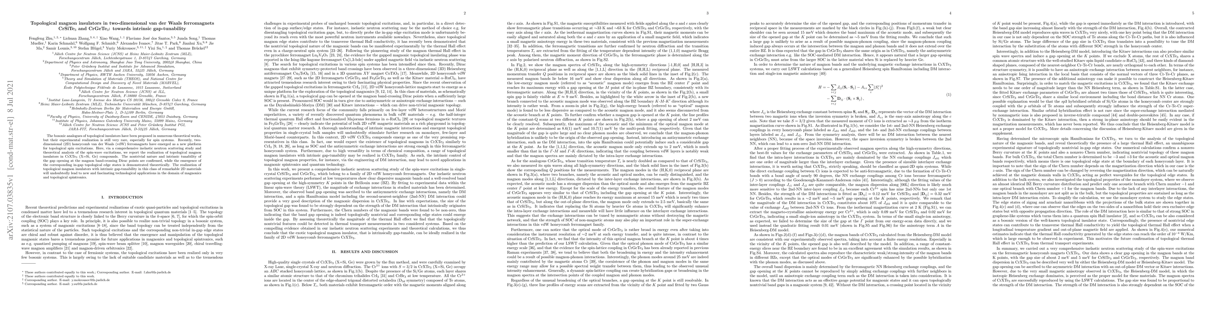 This paper reports the experimental realization of topological magnon insulators in two-dimensional van der Waals ferromagnets CrSiTe$_3$ and CrGeTe$_3$, confirmed through inelastic neutron scattering and theoretical analysis. The study demonstrates the intrinsic tunability of the gap at magnon band-crossing points, paving the way for advanced applications in magnonics and topological spintronics.