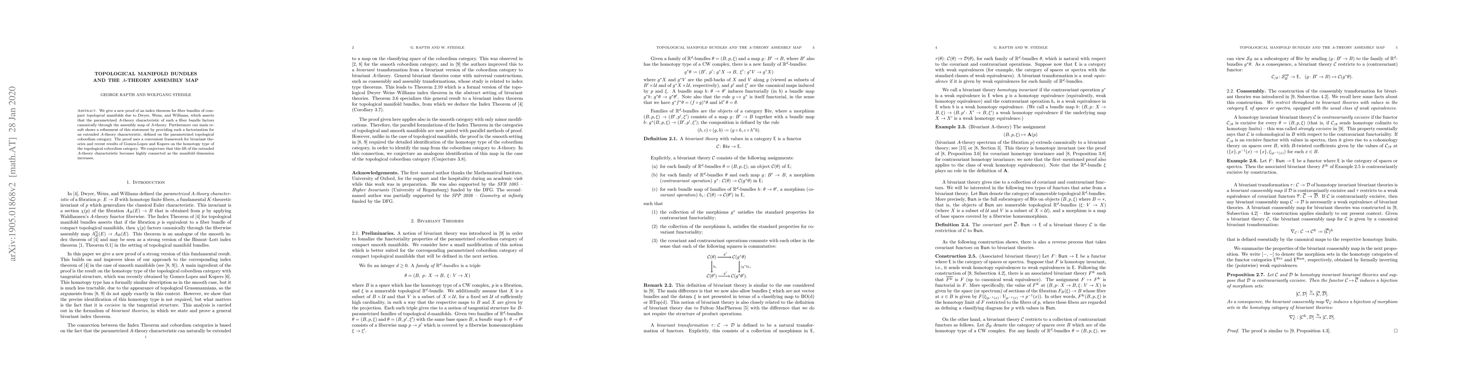We give a new proof of an index theorem for fiber bundles of compact topological manifolds due to Dwyer, Weiss, and Williams, which asserts that the parametrized $A$-theory characteristic of such a fiber bundle factors canonically through the assembly map of $A$-theory. Furthermore our main result shows a refinement of this statement by providing such a factorization for an extended $A$-theory characteristic, defined on the parametrized topological cobordism category. The proof uses a convenient framework for bivariant theories and recent results of Gomez-Lopez and Kupers on the homotopy type of the topological cobordism category. We conjecture that this lift of the extended $A$-theory characteristic becomes highly connected as the manifold dimension increases.