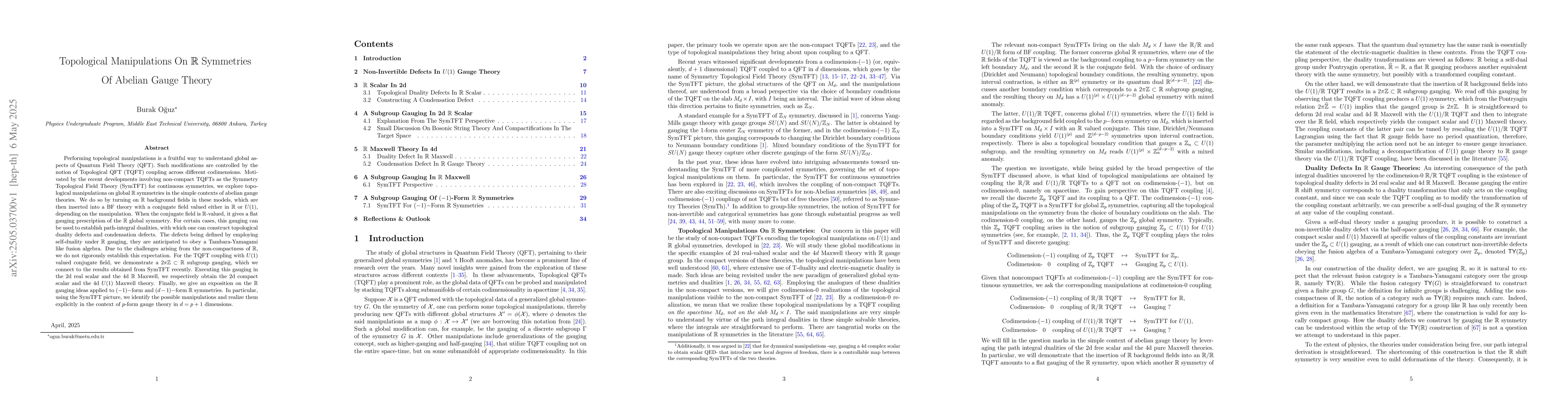 The paper introduces a method for topological manipulations on R symmetries in abelian gauge theories using TQFT coupling, leading to the construction of topological duality and condensation defects.