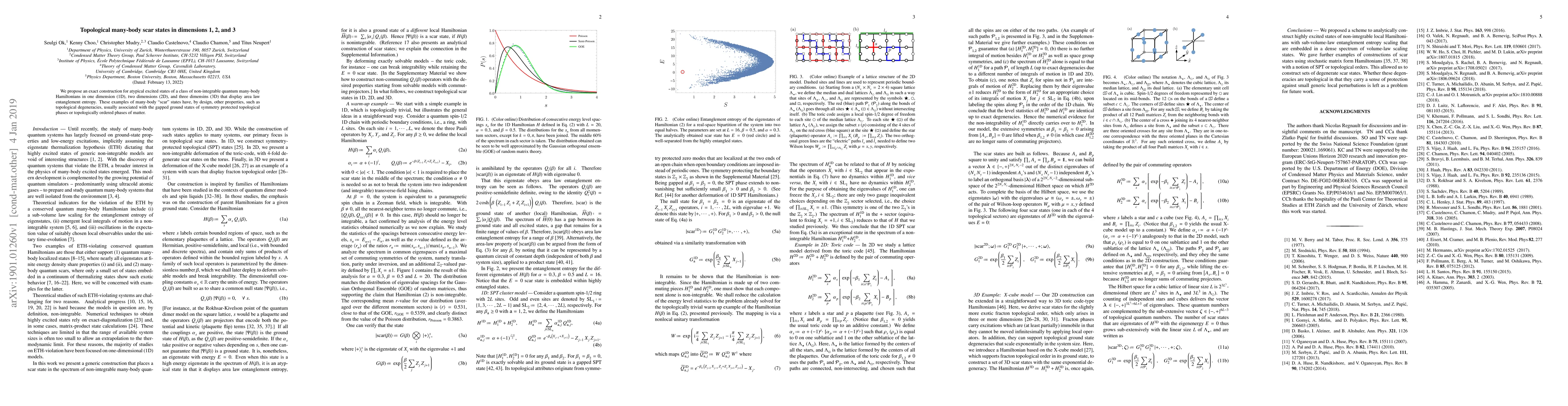We propose an exact construction for atypical excited states of a class of non-integrable quantum many-body Hamiltonians in one dimension (1D), two dimensions (2D), and three dimensins (3D) that display area law entanglement entropy. These examples of many-body `scar' states have, by design, other properties, such as topological degeneracies, usually associated with the gapped ground states of symmetry protected topological phases or topologically ordered phases of matter.