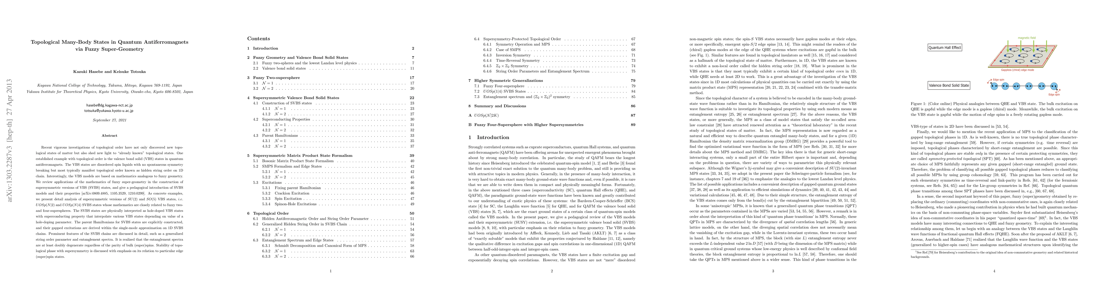 Recent vigorous investigations of topological order have not only discovered new topological states of matter but also shed new light to "already known" topological states. One established example with topological order is the valence bond solid (VBS) states in quantum antiferromagnets. The VBS states are disordered spin liquids with no spontaneous symmetry breaking but most typically manifest topological order known as hidden string order on 1D chain. Interestingly, the VBS models are based on mathematics analogous to fuzzy geometry. We review applications of the mathematics of fuzzy super-geometry in the construction of supersymmetric versions of VBS (SVBS) states, and give a pedagogical introduction of SVBS models and their properties [arXiv:0809.4885, 1105.3529, 1210.0299]. As concrete examples, we present detail analysis of supersymmetric versions of SU(2) and SO(5) VBS states, i.e. UOSp(N|2) and UOSp(N|4) SVBS states whose mathematics are closely related to fuzzy two- and four-superspheres. The SVBS states are physically interpreted as hole-doped VBS states with superconducting property that interpolate various VBS states depending on value of a hole-doping parameter. The parent Hamiltonians for SVBS states are explicitly constructed, and their gapped excitations are derived within the single-mode approximation on 1D SVBS chains. Prominent features of the SVBS chains are discussed in detail, such as a generalized string order parameter and entanglement spectra. It is realized that the entanglement spectra are at least doubly degenerate regardless of the parity of bulk (super)spins. Stability of topological phase with supersymmetry is discussed with emphasis on its relation to particular edge (super)spin states.