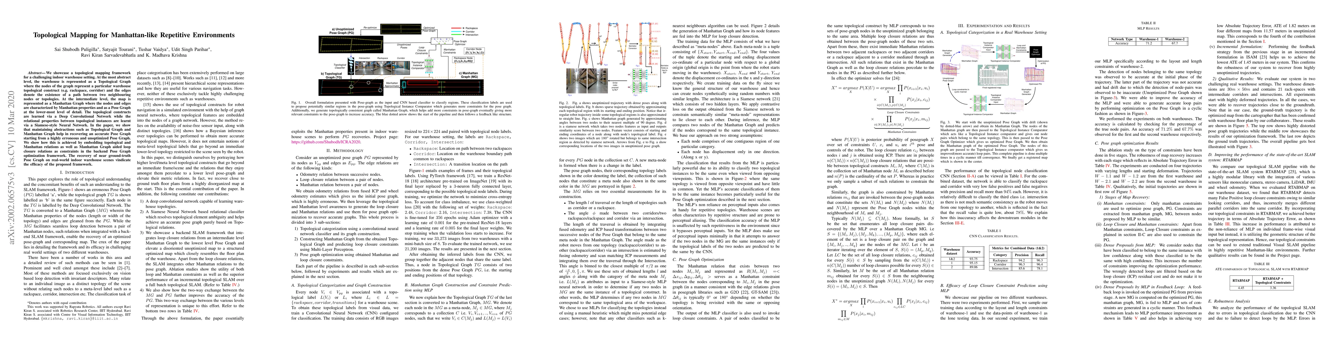 We showcase a topological mapping framework for a challenging indoor warehouse setting. At the most abstract level, the warehouse is represented as a Topological Graph where the nodes of the graph represent a particular warehouse topological construct (e.g. rackspace, corridor) and the edges denote the existence of a path between two neighbouring nodes or topologies. At the intermediate level, the map is represented as a Manhattan Graph where the nodes and edges are characterized by Manhattan properties and as a Pose Graph at the lower-most level of detail. The topological constructs are learned via a Deep Convolutional Network while the relational properties between topological instances are learnt via a Siamese-style Neural Network. In the paper, we show that maintaining abstractions such as Topological Graph and Manhattan Graph help in recovering an accurate Pose Graph starting from a highly erroneous and unoptimized Pose Graph. We show how this is achieved by embedding topological and Manhattan relations as well as Manhattan Graph aided loop closure relations as constraints in the backend Pose Graph optimization framework. The recovery of near ground-truth Pose Graph on real-world indoor warehouse scenes vindicate the efficacy of the proposed framework.