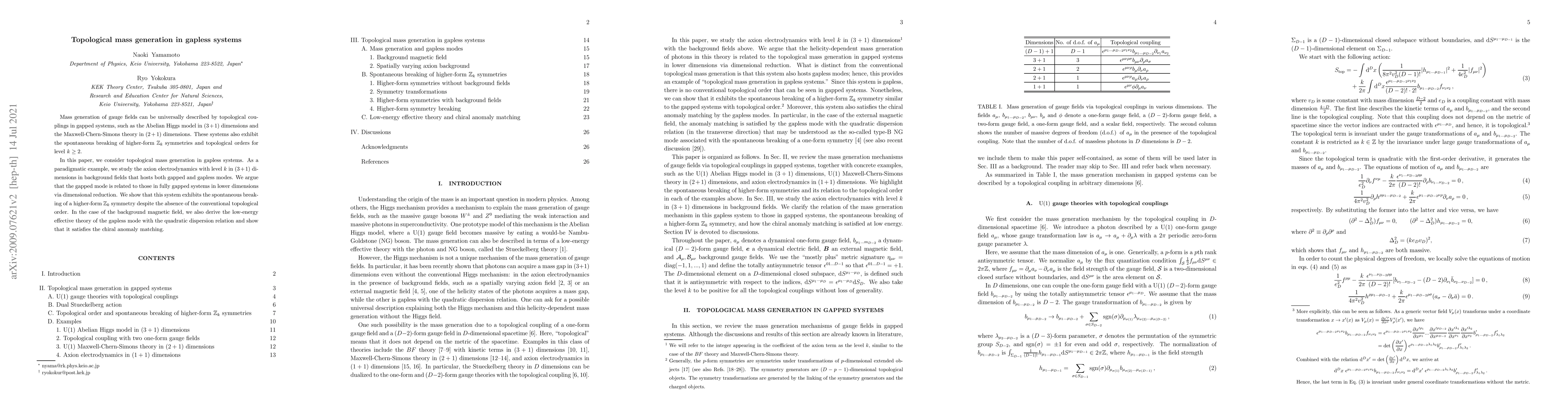 This paper investigates topological mass generation in gapless systems, focusing on axion electrodynamics in $(3+1)$ dimensions. It demonstrates that the gapless modes can still exhibit spontaneous higher-form symmetry breaking, and derives an effective theory for these modes that respects chiral anomaly matching.