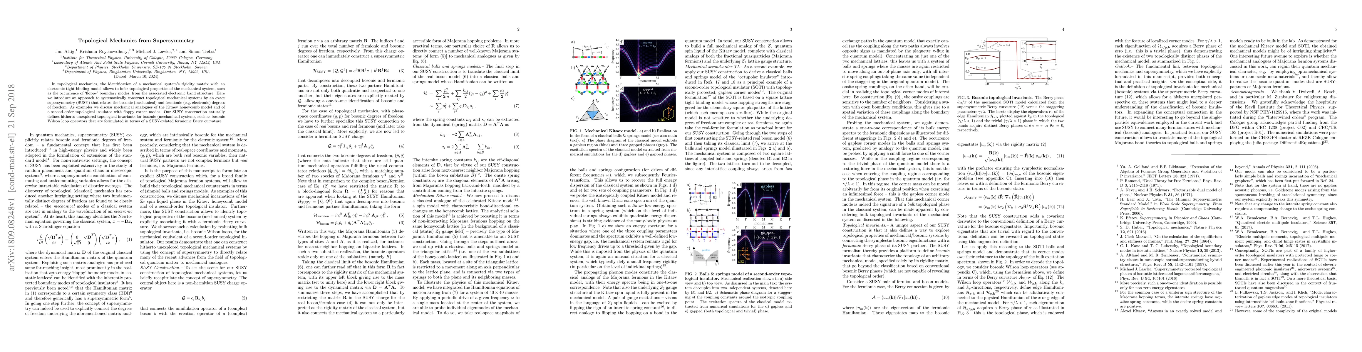In topological mechanics, the identification of a mechanical system's rigidity matrix with an electronic tight-binding model allows to infer topological properties of the mechanical system, such as the occurrence of `floppy' boundary modes, from the associated electronic band structure. Here we introduce an approach to systematically construct topological mechanical systems by an exact supersymmetry (SUSY) that relates the bosonic (mechanical) and fermionic (e.g. electronic) degrees of freedom. As examples we discuss mechanical analogues of the Kitaev honeycomb model and of a second-order topological insulator with floppy corner modes. Our SUSY construction naturally defines hitherto unexplored topological invariants for bosonic (mechanical) systems, such as bosonic Wilson loop operators that are formulated in terms of a SUSY-related fermionic Berry curvature.