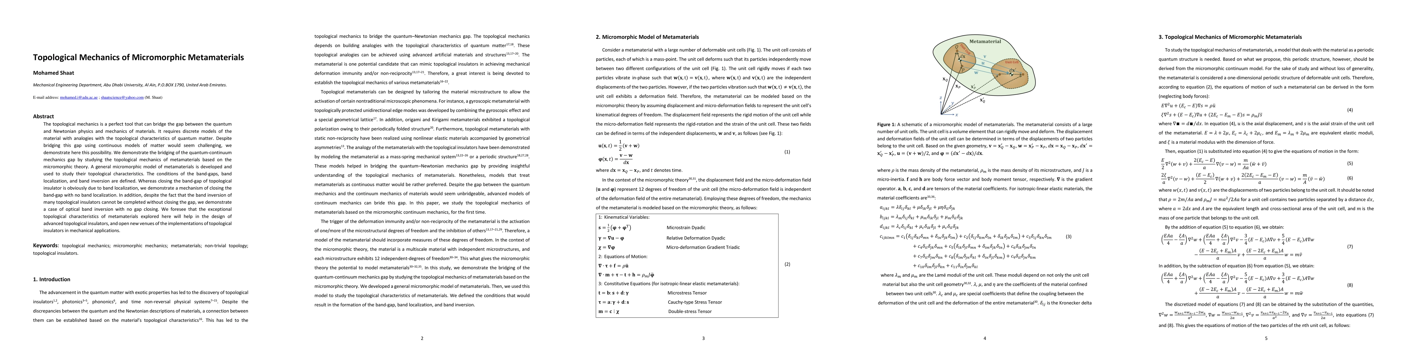 This paper develops a micromorphic model for metamaterials to bridge the quantum-continuum mechanics gap, demonstrating topological characteristics such as band-gaps, band localization, and band inversion without traditional mechanisms. The study opens new avenues for designing advanced topological insulators and their mechanical applications.
