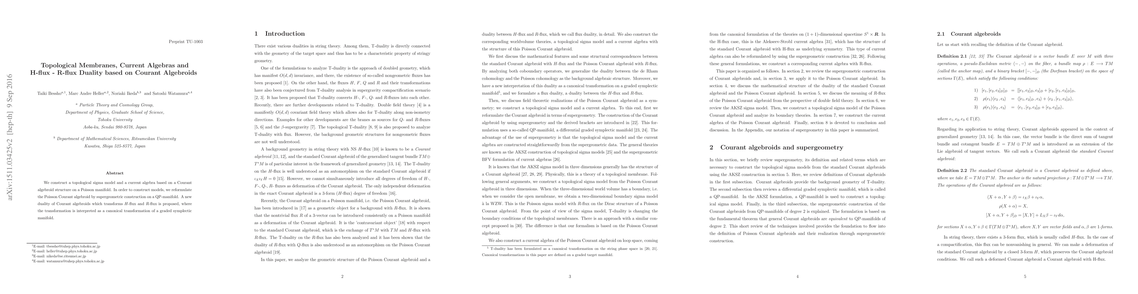 This paper constructs a topological sigma model and current algebra based on a Courant algebroid on a Poisson manifold, reformulated via supergeometric construction on a QP-manifold. It introduces a new duality transforming H-flux and R-flux, interpreted as a canonical transformation on a graded symplectic manifold.