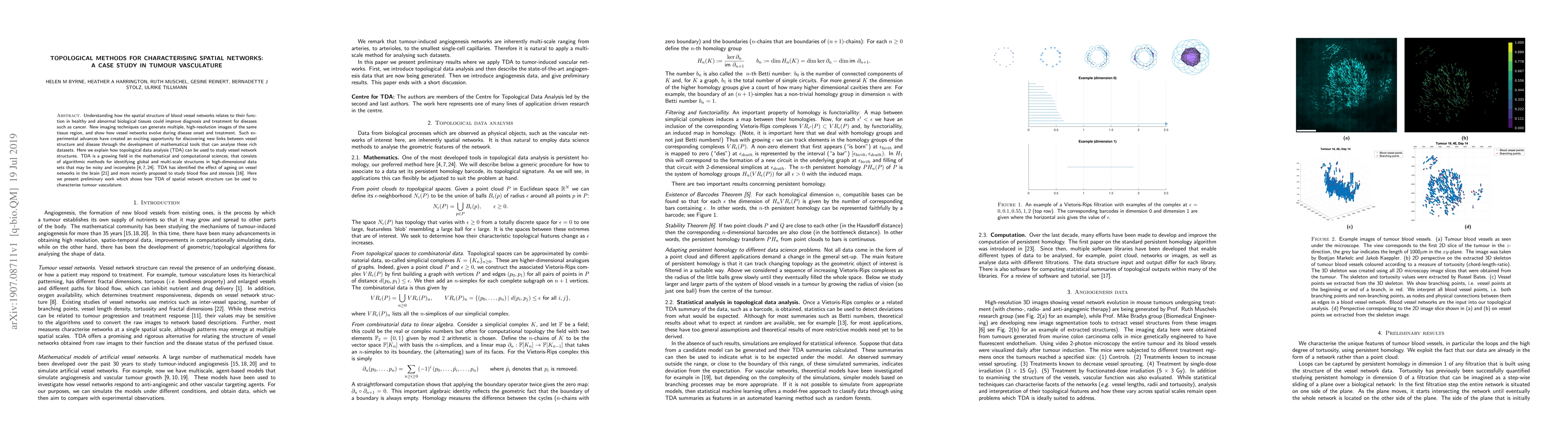 Understanding how the spatial structure of blood vessel networks relates to their function in healthy and abnormal biological tissues could improve diagnosis and treatment for diseases such as cancer. New imaging techniques can generate multiple, high-resolution images of the same tissue region, and show how vessel networks evolve during disease onset and treatment. Such experimental advances have created an exciting opportunity for discovering new links between vessel structure and disease through the development of mathematical tools that can analyse these rich datasets. Here we explain how topological data analysis (TDA) can be used to study vessel network structures. TDA is a growing field in the mathematical and computational sciences, that consists of algorithmic methods for identifying global and multi-scale structures in high-dimensional data sets that may be noisy and incomplete. TDA has identified the effect of ageing on vessel networks in the brain and more recently proposed to study blood flow and stenosis. Here we present preliminary work which shows how TDA of spatial network structure can be used to characterise tumour vasculature.