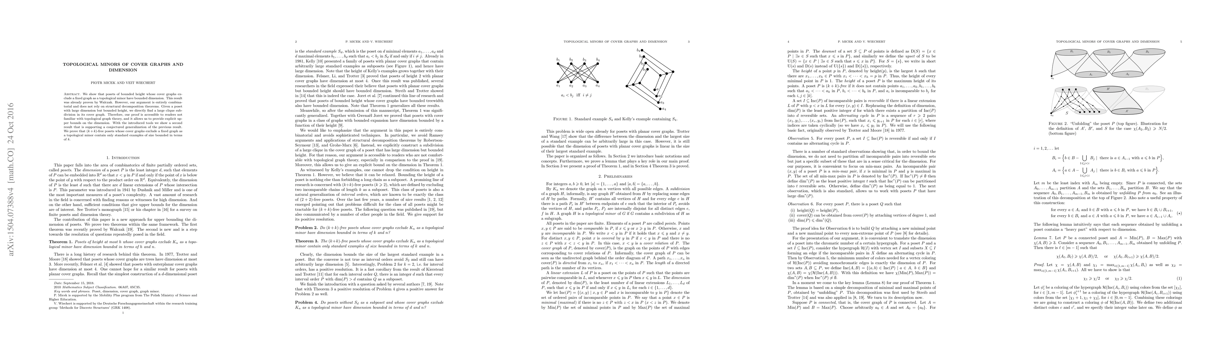 This paper demonstrates that posets with bounded height and cover graphs excluding a fixed topological minor have bounded dimension, providing a combinatorial proof without relying on structural decomposition theorems. It also supports a conjectured generalization by showing that $(k+k)$-free posets with such cover graphs contain only standard examples of size bounded by $k$.
