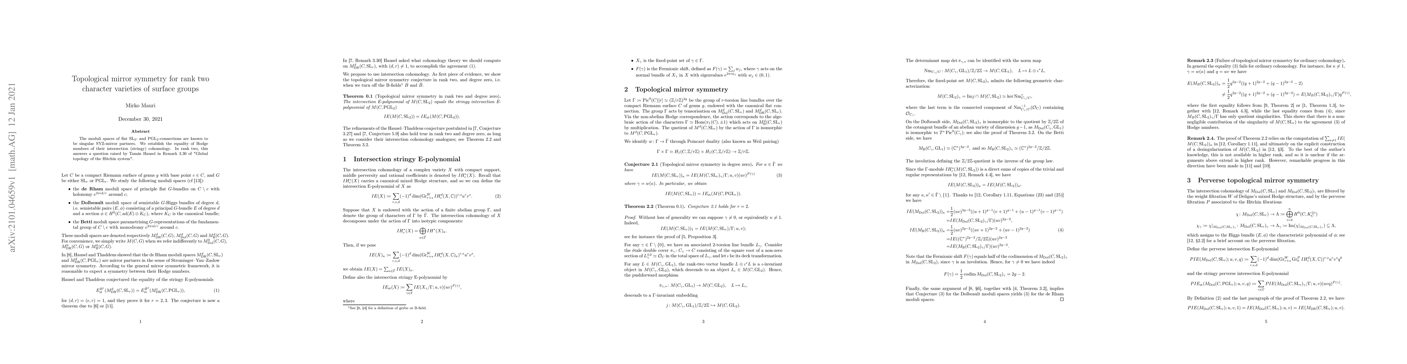 The moduli spaces of flat $\mathrm{SL}_2$- and $\mathrm{PGL}_2$-connections are known to be singular SYZ-mirror partners. We establish the equality of Hodge numbers of their intersection (stringy) cohomology. In rank two, this answers a question raised by Tam\'as Hausel in Remark 3.30 of "Global topology of the Hitchin system".