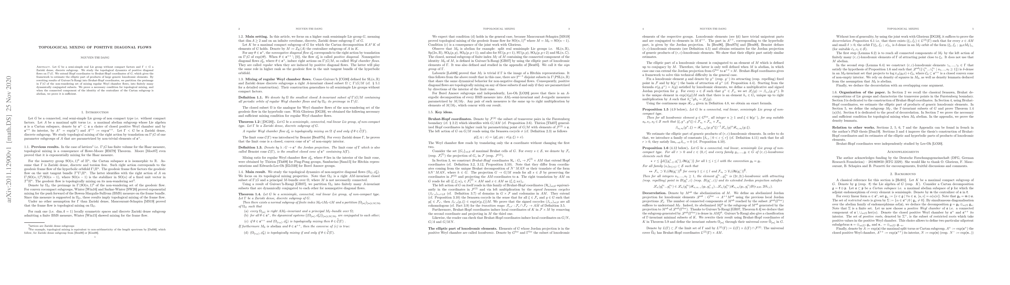 Let $G$ be a semi-simple real Lie group without compact factors and $ \Gamma < G$ a Zariski dense, discrete subgroup. We study the topological dynamics of positive diagonal flows on $\Gamma \backslash G$. We extend Hopf coordinates to Bruhat-Hopf coordinates of $G$, which gives the framework to estimate the elliptic part of products of large generic loxodromic elements. By rewriting results of Guivarc'h-Raugi into Bruhat-Hopf coordinates, we partition the preimage in $\Gamma \backslash G$ of the non-wandering set of mixing regular Weyl chamber flows, into finitely many dynamically conjugated subsets. We prove a necessary condition for topological mixing, and when the connected component of the identity of the centralizer of the Cartan subgroup is abelian, we prove it is sufficient.