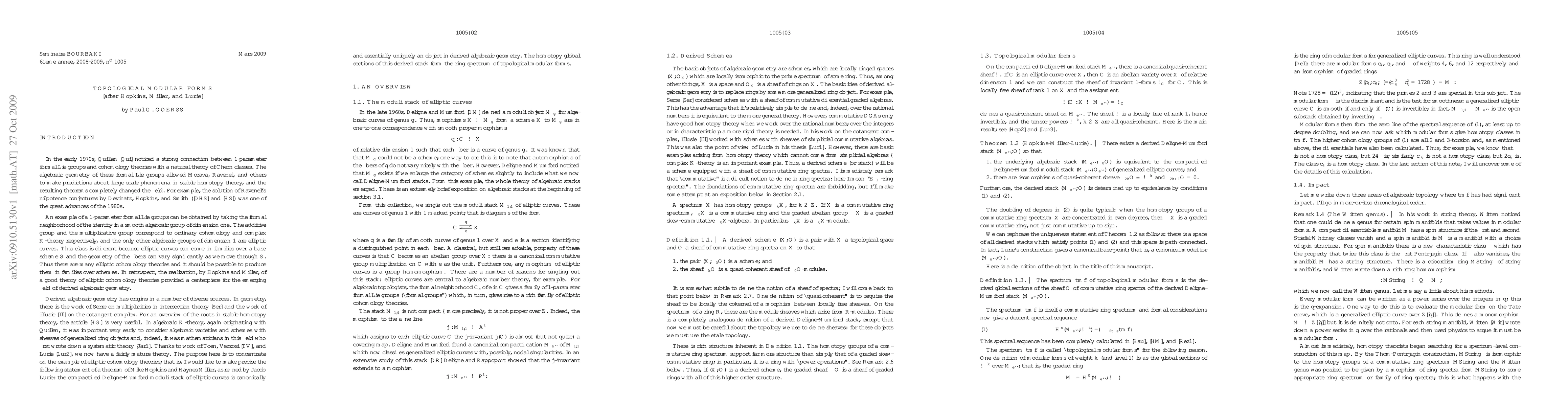 This is the companion article to the Bourbaki talk of the same name given in March 2009. The main theme of the talk and the article is to explain the interplay between homotopy theory and algebraic geometry through the Hopkins-Miller-Lurie theorem on topological modular forms, from which we learn that the Deligne-Mumford moduli stack for elliptic curves is canonically realized as an object in derived algebraic geometry.