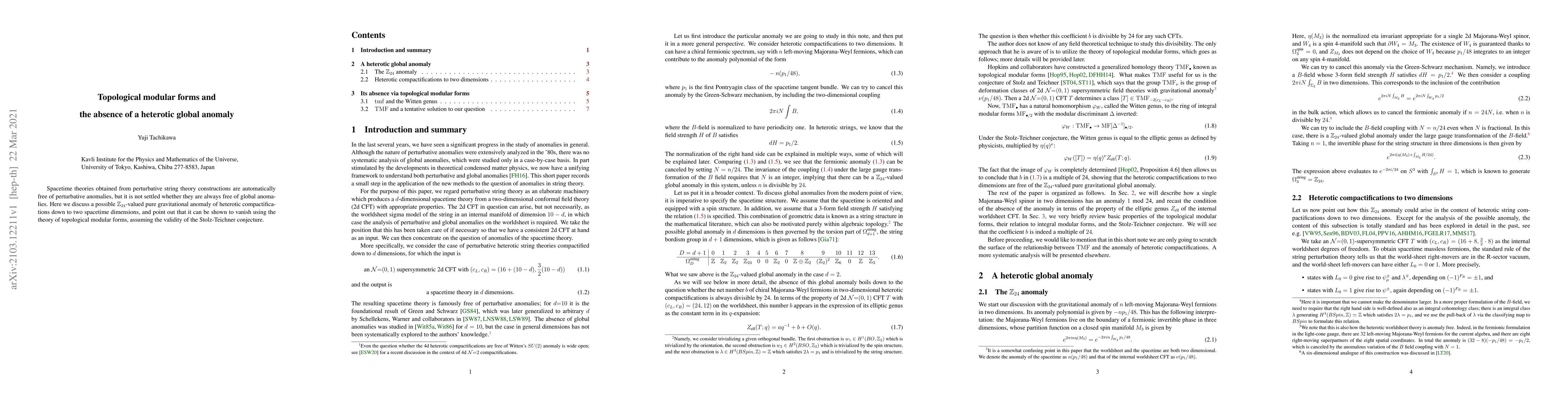 Spacetime theories obtained from perturbative string theory constructions are automatically free of perturbative anomalies, but it is not settled whether they are always free of global anomalies. Here we discuss a possible $\mathbb{Z}_{24}$-valued pure gravitational anomaly of heterotic compactifications down to two spacetime dimensions, and point out that it can be shown to vanish using the theory of topological modular forms, assuming the validity of the Stolz-Teichner conjecture.