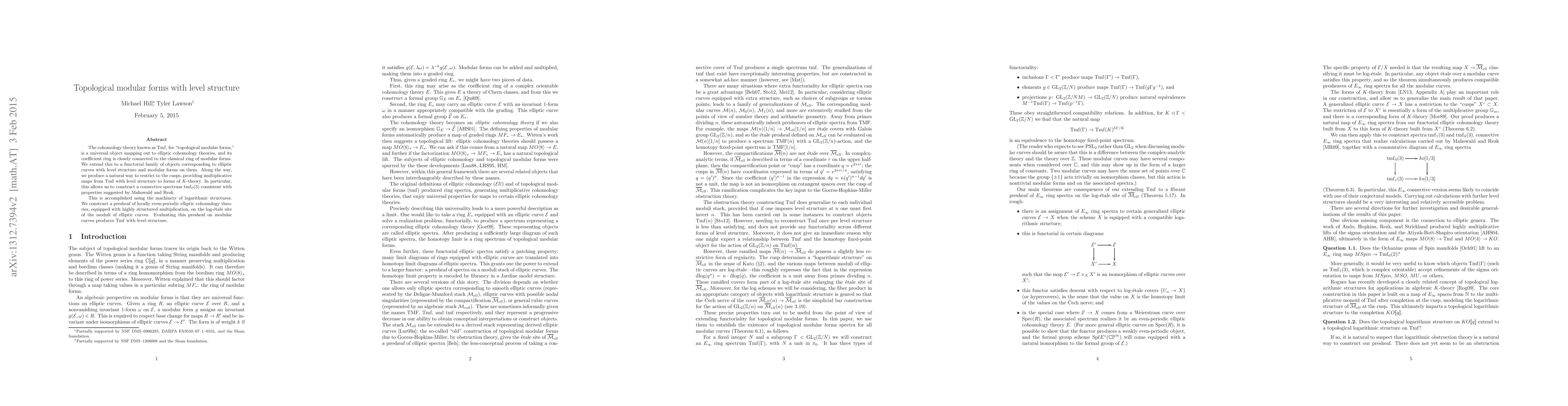 Summary: This paper extends topological modular forms (Tmf) to elliptic curves with level structure, using logarithmic structures to create a sheaf of elliptic cohomology theories. This leads to multiplicative maps from Tmf to modular forms and the construction of a connective spectrum tmf_0(3) aligned with suggested properties.