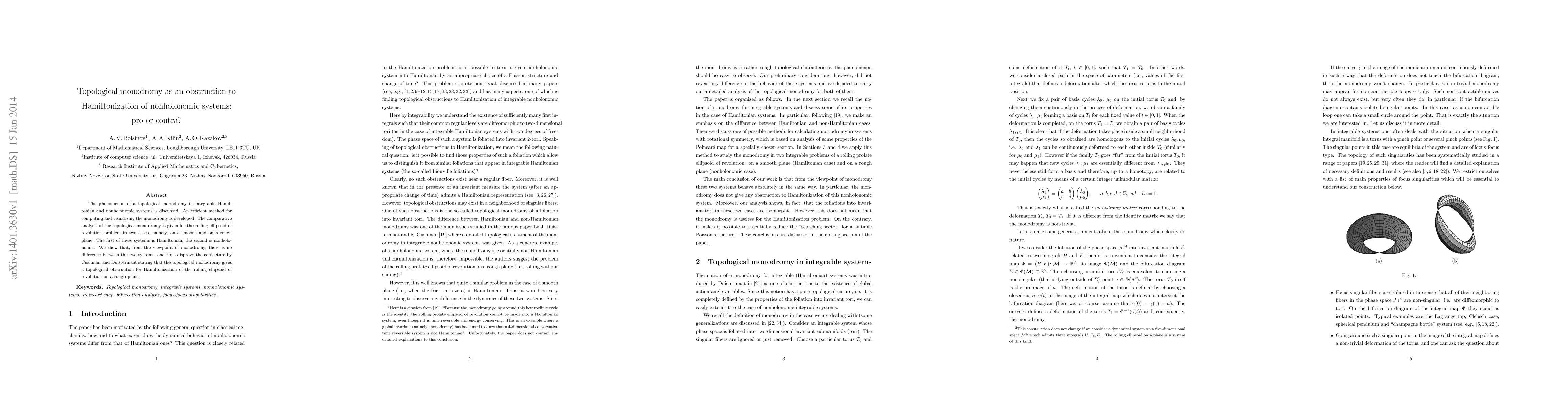 The paper discusses topological monodromy in integrable Hamiltonian and nonholonomic systems, developing a method for its computation and visualization. It finds no difference in monodromy between a Hamiltonian system and a nonholonomic one, disproving the conjecture that monodromy obstructs Hamiltonization in nonholonomic systems.