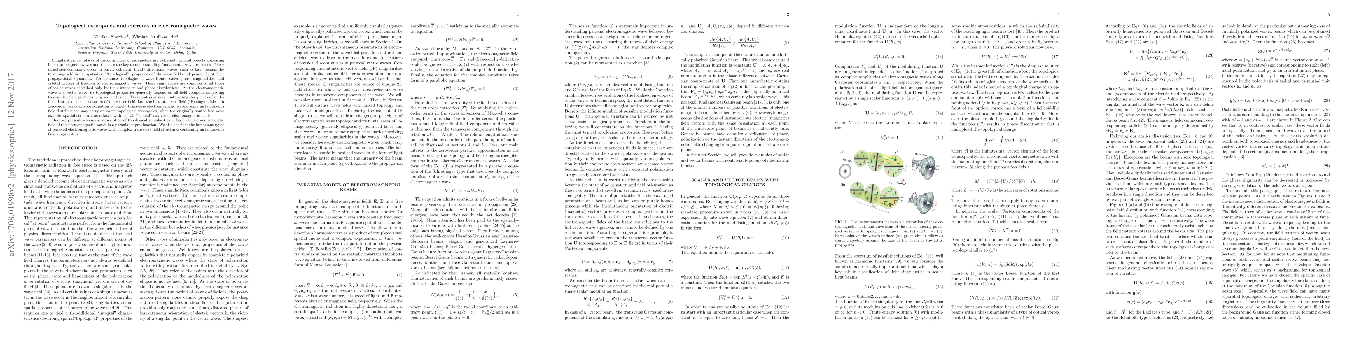 This paper investigates topological singularities and currents in electromagnetic waves, focusing on phase singularities and instantaneous field singularities in coherent waves like laser beams. It systematically describes the topological monopoles and complex field patterns arising in the electric and magnetic fields of paraxial electromagnetic waves.
