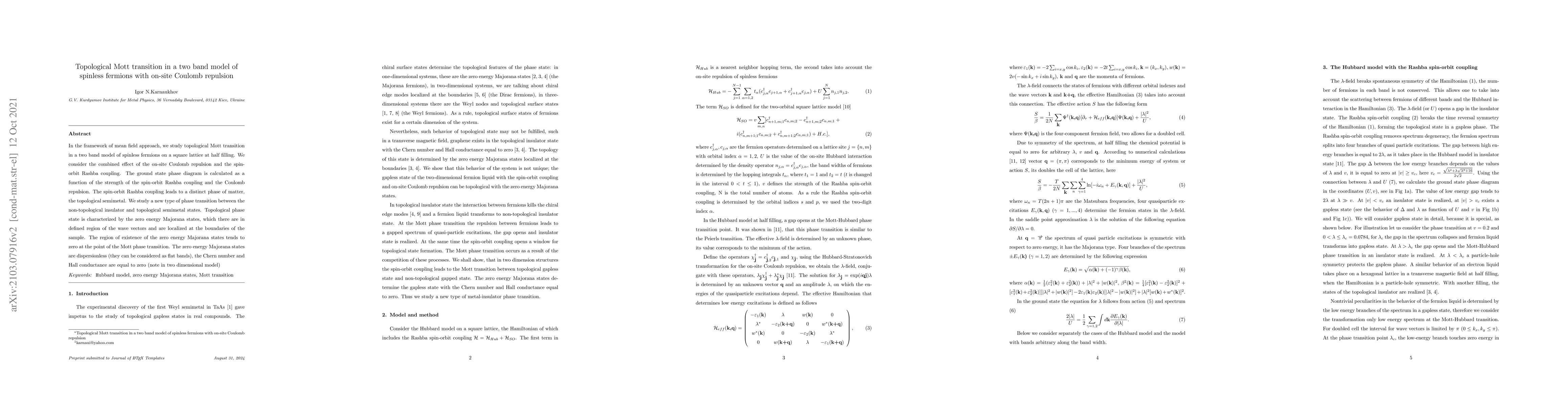 This paper investigates the topological Mott transition in a two-band model of spinless fermions on a square lattice, focusing on the interplay between on-site Coulomb repulsion and spin-orbit Rashba coupling. The study reveals a topological semimetal phase characterized by zero energy Majorana states localized at the sample boundaries, which vanish at the Mott transition point.