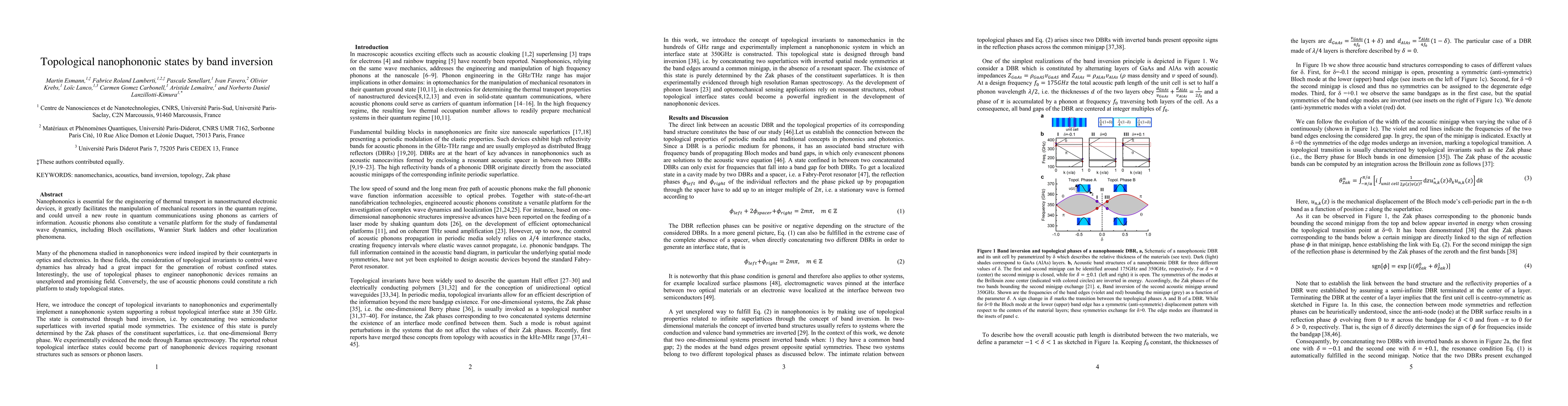 Nanophononics is essential for the engineering of thermal transport in nanostructured electronic devices, it greatly facilitates the manipulation of mechanical resonators in the quantum regime, and could unveil a new route in quantum communications using phonons as carriers of information. Acoustic phonons also constitute a versatile platform for the study of fundamental wave dynamics, including Bloch oscillations, Wannier Stark ladders and other localization phenomena. Many of the phenomena studied in nanophononics were indeed inspired by their counterparts in optics and electronics. In these fields, the consideration of topological invariants to control wave dynamics has already had a great impact for the generation of robust confined states. Interestingly, the use of topological phases to engineer nanophononic devices remains an unexplored and promising field. Conversely, the use of acoustic phonons could constitute a rich platform to study topological states. Here, we introduce the concept of topological invariants to nanophononics and experimentally implement a nanophononic system supporting a robust topological interface state at 350 GHz. The state is constructed through band inversion, i.e. by concatenating two semiconductor superlattices with inverted spatial mode symmetries. The existence of this state is purely determined by the Zak phases of the constituent superlattices, i.e. that one-dimensional Berry phase. We experimentally evidenced the mode through Raman spectroscopy. The reported robust topological interface states could become part of nanophononic devices requiring resonant structures such as sensors or phonon lasers.