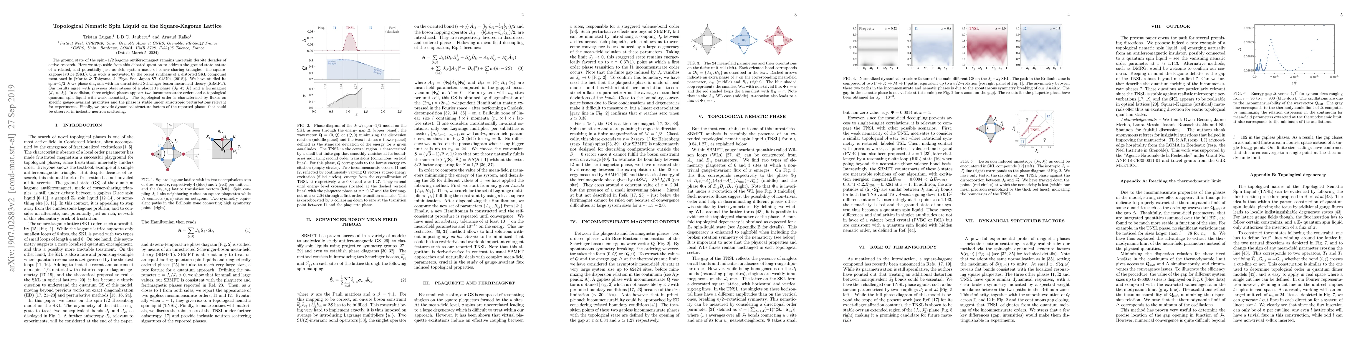 This paper investigates the spin-1/2 J1-J2 model on the square-kagome lattice, revealing three new phases: two incommensurate orders and a topological nematic spin liquid. The topological phase is characterized by stable fluxes and weak nematicity, with potential observable signatures in neutron scattering experiments.