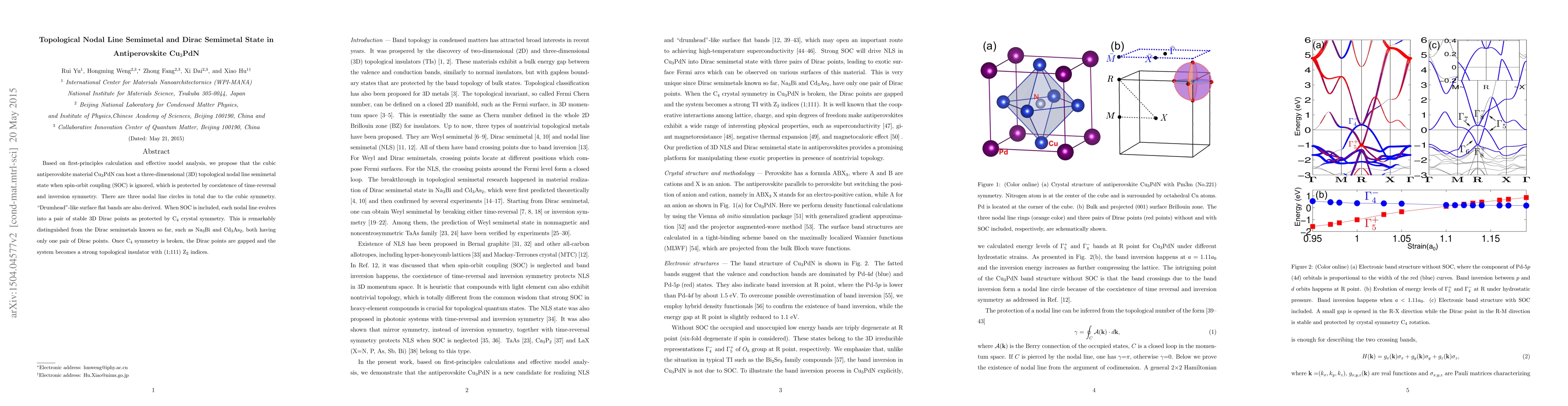 The paper proposes that Cu$_3$PdN exhibits a unique topological nodal line semimetal state with three nodal line circles when spin-orbit coupling is ignored, evolving into pairs of Dirac points when included, differing from known Dirac semimetals. The material can also become a strong topological insulator when C$_4$ symmetry is broken.