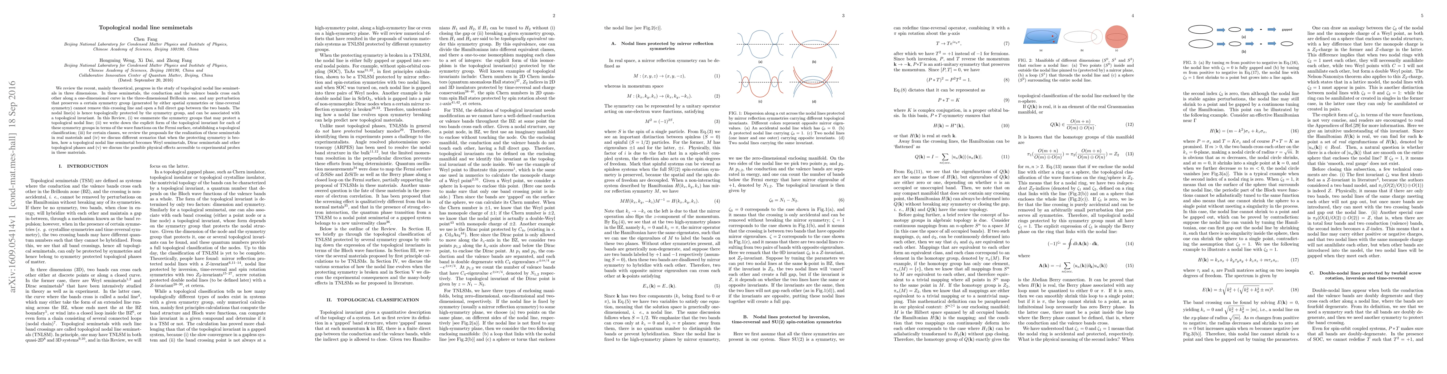 This paper reviews theoretical advancements in topological nodal line semimetals, emphasizing their protected one-dimensional nodal lines by symmetry groups, and their classification through topological invariants. It also discusses material realizations and transitions to other topological phases upon symmetry breaking.