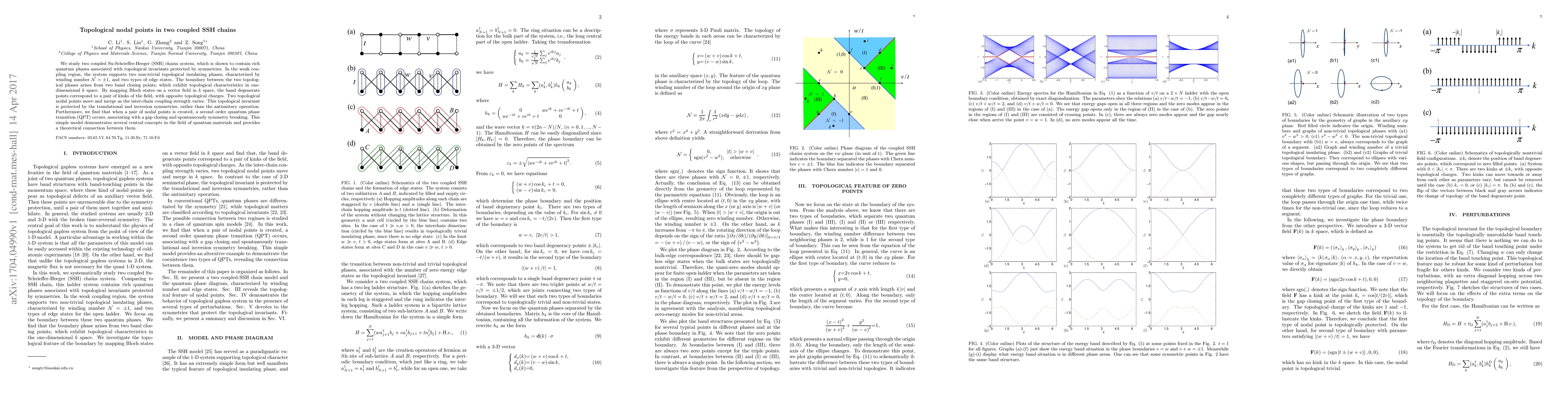 We study two coupled Su-Schrieffer-Heeger (SSH) chains system, which is shown to contain rich quantum phases associated with topological invariants protected by symmetries. In the weak coupling region, the system supports two non-trivial topological insulating phases, characterized by winding number N = +1 or -1, and two types of edge states. The boundary between the two topological phases arises from two band closing points, which exhibit topological characteristics in one-dimensional k space. By mapping Bloch states on a vector field in k space, the band degenerate points correspond to a pair of kinks of the field, with opposite topological charges. Two topological nodal points move and merge as the inter-chain coupling strength varies. This topological invariant is protected by the translational and inversion symmetries, rather than the antiunitary operation. Furthermore, we find that when a pair of nodal points is created, a second order quantum phase transition (QPT) occurs, associating with a gap closing and spontaneously symmetry breaking. This simple model demonstrates several central concepts in the field of quantum materials and provides a theoretical connection between them.