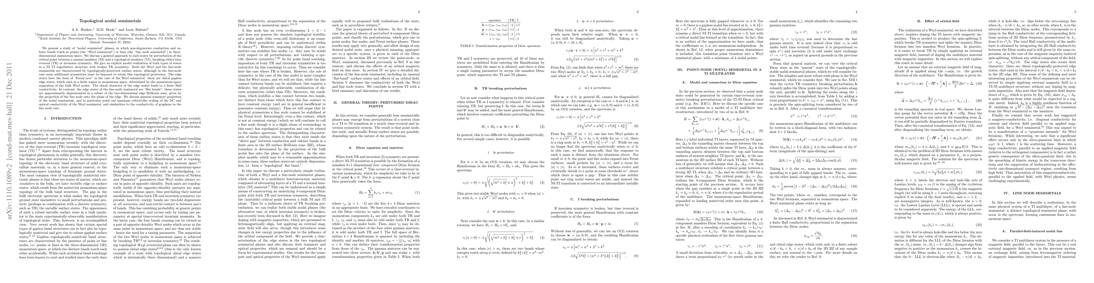 This paper investigates topological nodal semimetals, where conduction and valence bands touch at points or lines in momentum space, leading to Weyl and line-node semimetals. The study explores their topologically protected surface states and unusual transport properties, including chiral Fermi arcs in Weyl semimetals and flat bands in line-node semimetals.