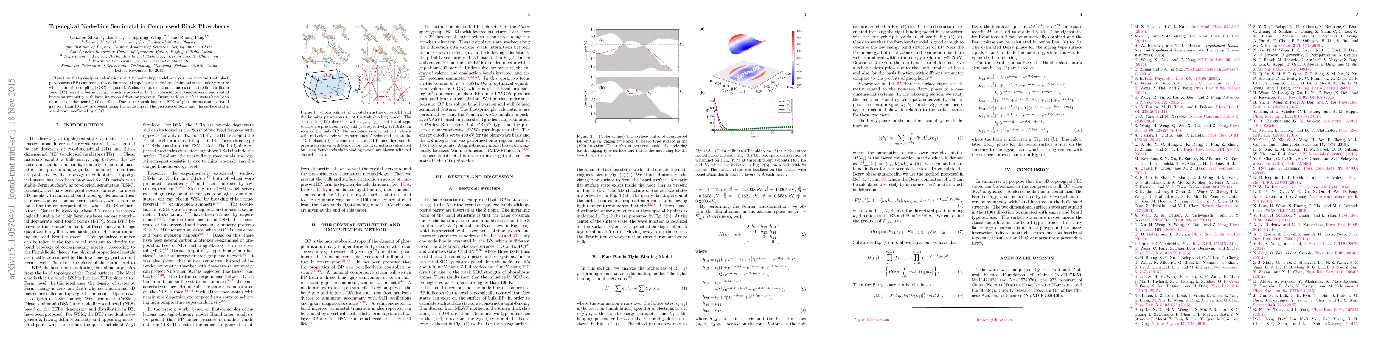 This paper proposes that black phosphorus can exhibit a topological node-line semimetal state under pressure, characterized by a closed topological node line protected by symmetry and band inversion. The presence of spin-orbit coupling introduces a small band gap but minimally affects the surface states.