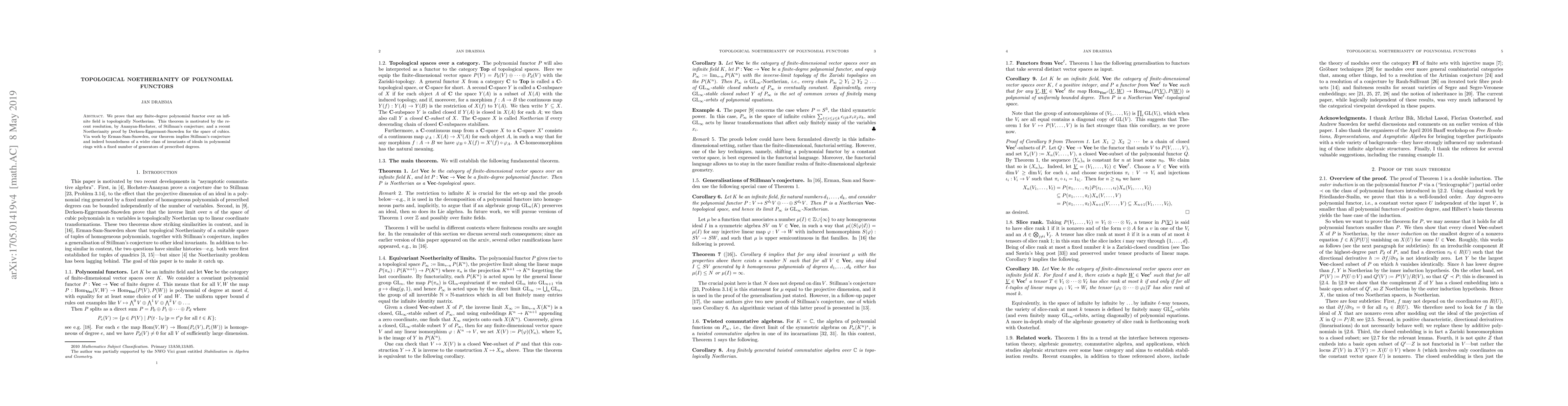 The paper proves finite-degree polynomial functors are topologically Noetherian, implying resolution of Stillman's conjecture and providing a broader Noetherianity result for polynomial ring ideal invariants with fixed generators and degrees.