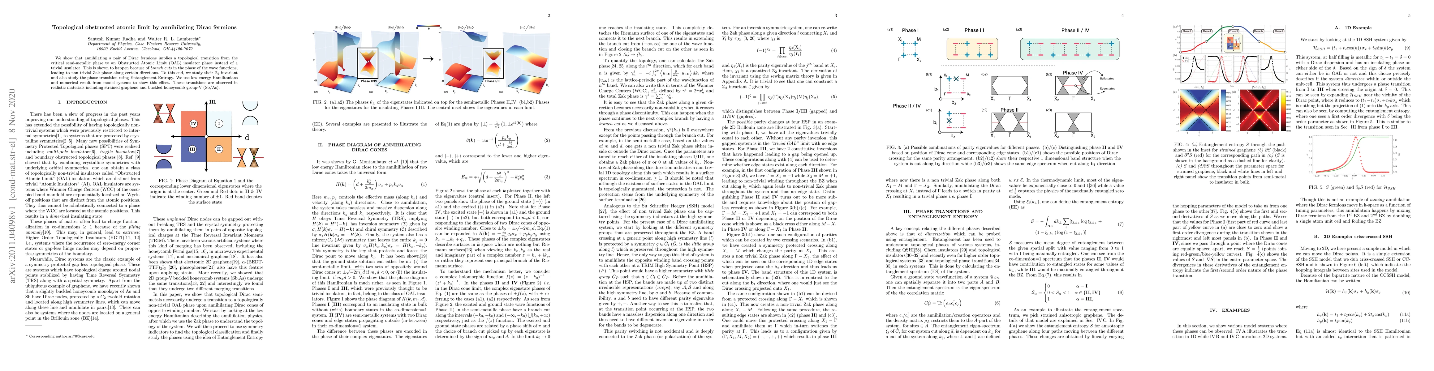 We show that annihilating a pair of Dirac fermions implies a topological transition from the critical semi-metallic phase to an Obstructed Atomic Limit (OAL) insulator phase instead of a trivial insulator. This is shown to happen because of branch-cuts in the phase of the wave functions, leading to non trivial Zak phase along certain directions. To this end, we study their Z$_2$ invariant and also study the phase transition using Entanglement Entropy. We use low energy Hamiltonians and numerical result from model systems to show this effect. These transitions are observed in realistic materials including strained graphene and buckled honeycomb group-V (Sb/As).