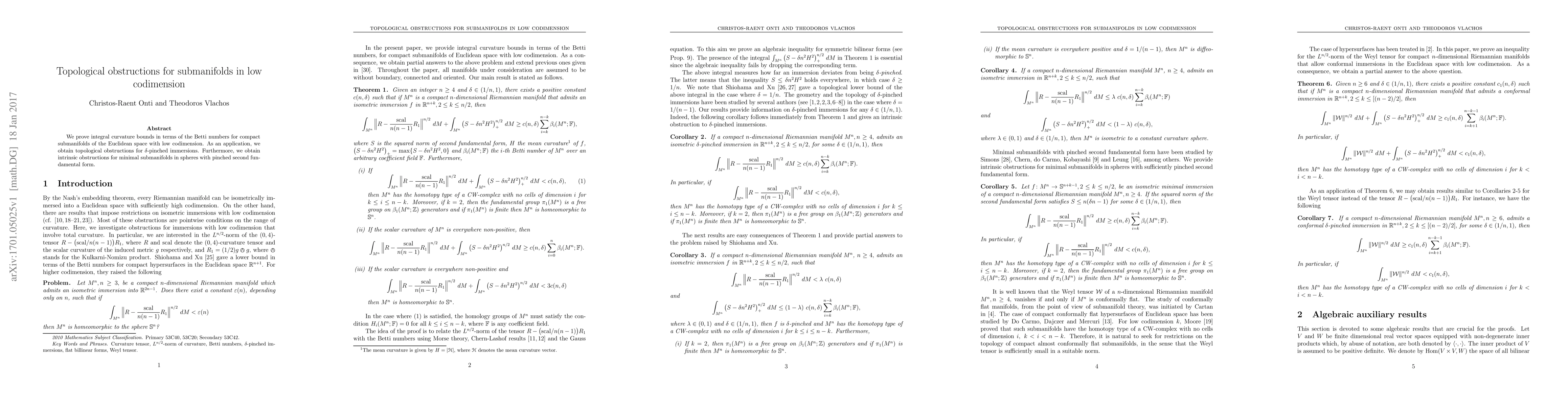 This paper establishes integral curvature bounds linked to Betti numbers for low codimension submanifolds in Euclidean space, and uses these to derive topological obstructions for $\delta$-pinched immersions and intrinsic obstructions for minimal submanifolds in spheres with pinched second fundamental form.