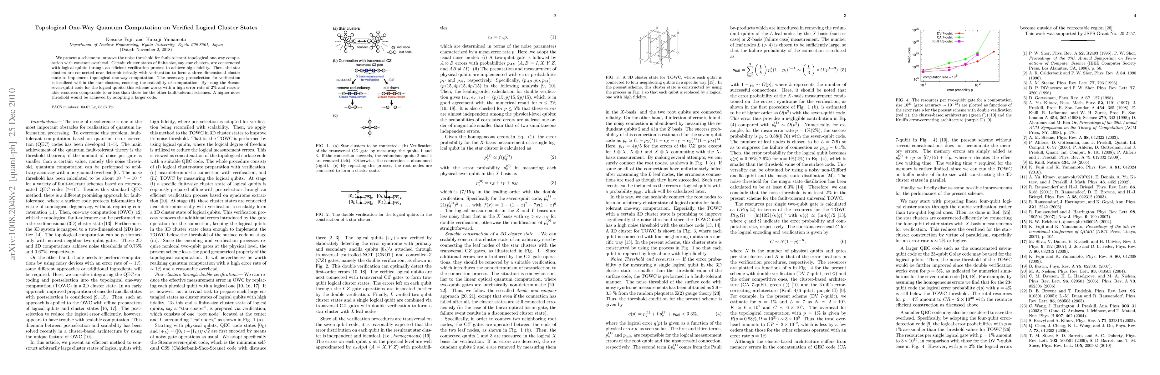 This paper proposes a method to enhance the noise threshold for fault-tolerant topological one-way quantum computation using star cluster states, achieving high fidelity through efficient verification. The scheme connects these clusters to form a three-dimensional state, maintaining localized postselection for verification and demonstrating a high error rate of approximately 1%.