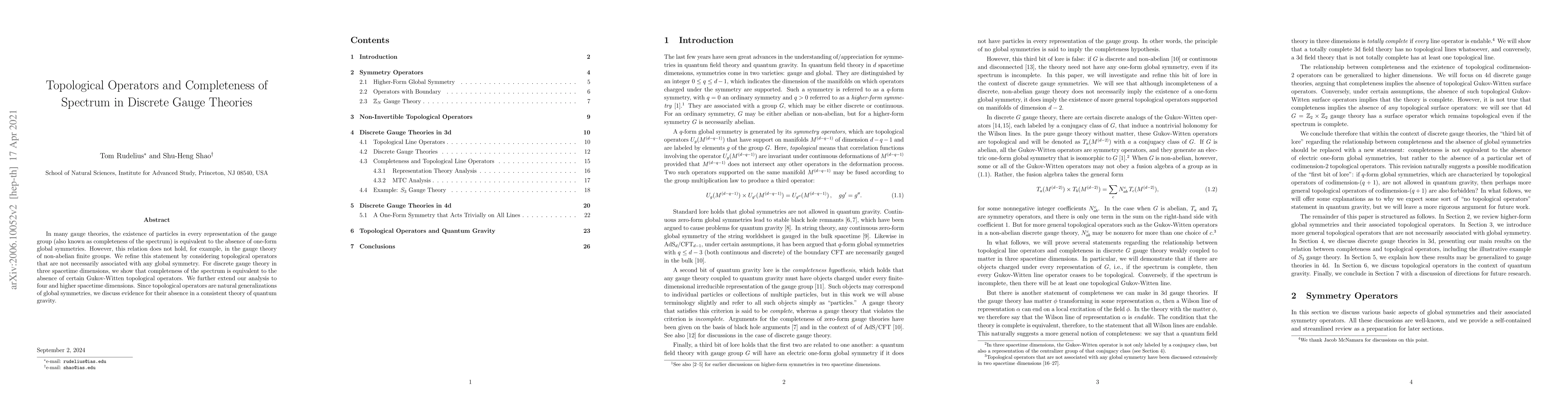 In many gauge theories, the existence of particles in every representation of the gauge group (also known as completeness of the spectrum) is equivalent to the absence of one-form global symmetries. However, this relation does not hold, for example, in the gauge theory of non-abelian finite groups. We refine this statement by considering topological operators that are not necessarily associated with any global symmetry. For discrete gauge theory in three spacetime dimensions, we show that completeness of the spectrum is equivalent to the absence of certain Gukov-Witten topological operators. We further extend our analysis to four and higher spacetime dimensions. Since topological operators are natural generalizations of global symmetries, we discuss evidence for their absence in a consistent theory of quantum gravity.