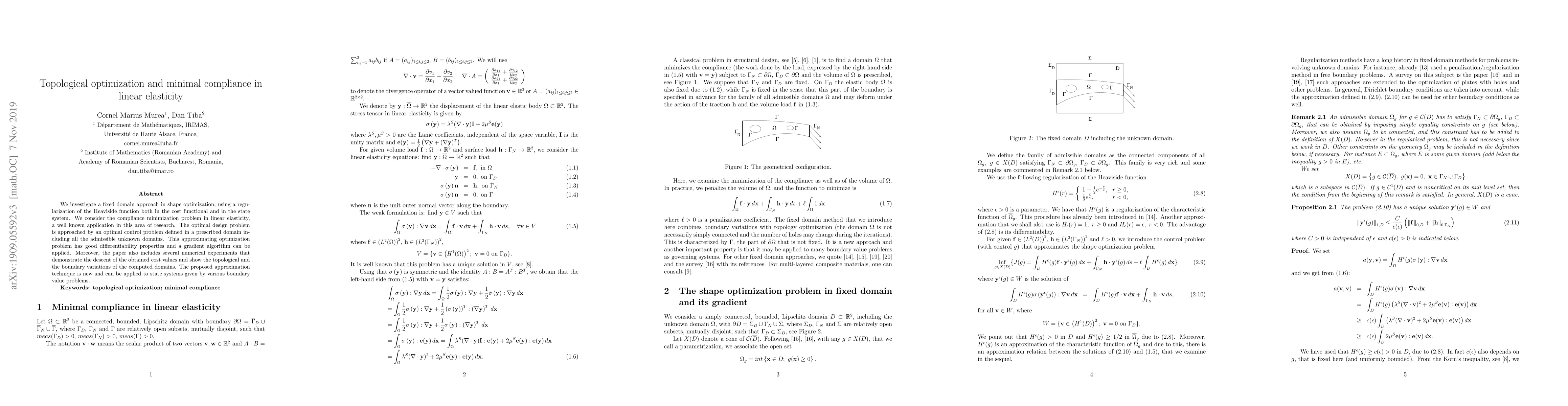 We investigate a fixed domain approach in shape optimization, using a regularization of the Heaviside function both in the cost functional and in the state system. We consider the compliance minimization problem in linear elasticity, a well known application in this area of research. The optimal design problem is approached by an optimal control problem defined in a prescribed domain including all the admissible unknown domains. This approximating optimization problem has good differentiability properties and a gradient algorithm can be applied. Moreover, the paper also includes several numerical experiments that demonstrate the descent of the obtained cost values and show the topological and the boundary variations of the computed domains. The proposed approximation technique is new and can be applied to state systems given by various boundary value problems.