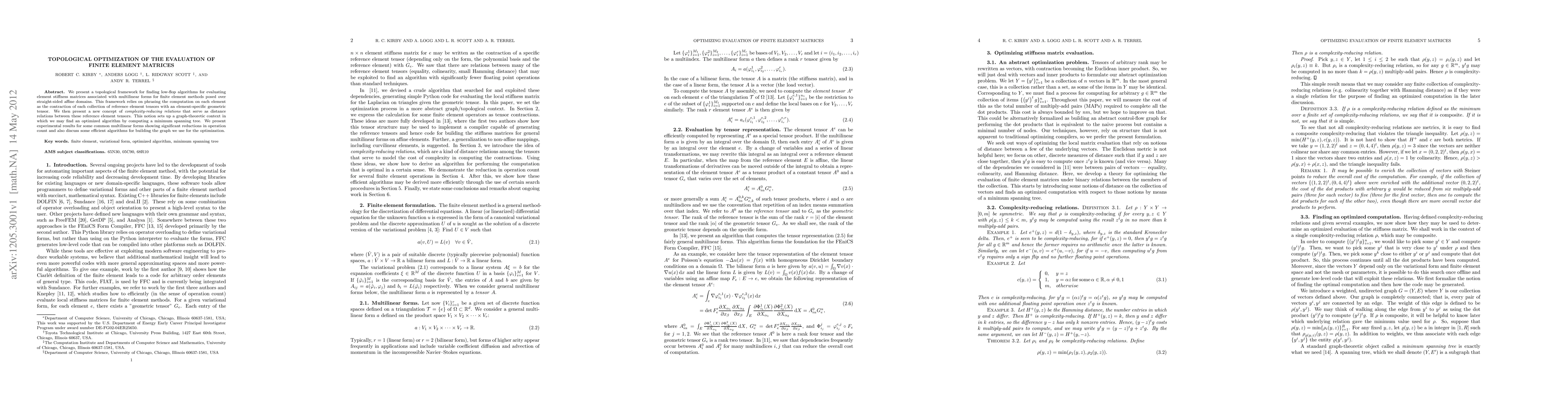 We present a topological framework for finding low-flop algorithms for evaluating element stiffness matrices associated with multilinear forms for finite element methods posed over straight-sided affine domains. This framework relies on phrasing the computation on each element as the contraction of each collection of reference element tensors with an element-specific geometric tensor. We then present a new concept of complexity-reducing relations that serve as distance relations between these reference element tensors. This notion sets up a graph-theoretic context in which we may find an optimized algorithm by computing a minimum spanning tree. We present experimental results for some common multilinear forms showing significant reductions in operation count and also discuss some efficient algorithms for building the graph we use for the optimization.