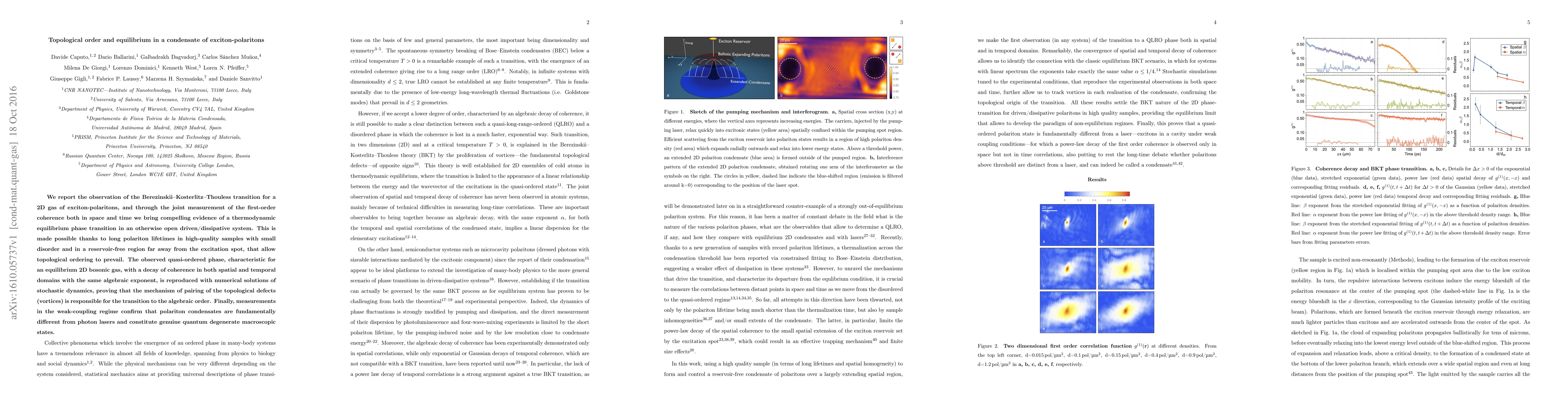 We report the observation of the Berezinskii-Kosterlitz-Thouless transition for a 2D gas of exciton-polaritons, and through the joint measurement of the first-order coherence both in space and time we bring compelling evidence of a thermodynamic equilibrium phase transition in an otherwise open driven/dissipative system. This is made possible thanks to long polariton lifetimes in high-quality samples with small disorder and in a reservoir-free region far away from the excitation spot, that allow topological ordering to prevail. The observed quasi-ordered phase, characteristic for an equilibrium 2D bosonic gas, with a decay of coherence in both spatial and temporal domains with the same algebraic exponent, is reproduced with numerical solutions of stochastic dynamics, proving that the mechanism of pairing of the topological defects (vortices) is responsible for the transition to the algebraic order. Finally, measurements in the weak-coupling regime confirm that polariton condensates are fundamentally different from photon lasers and constitute genuine quantum degenerate macroscopic states.