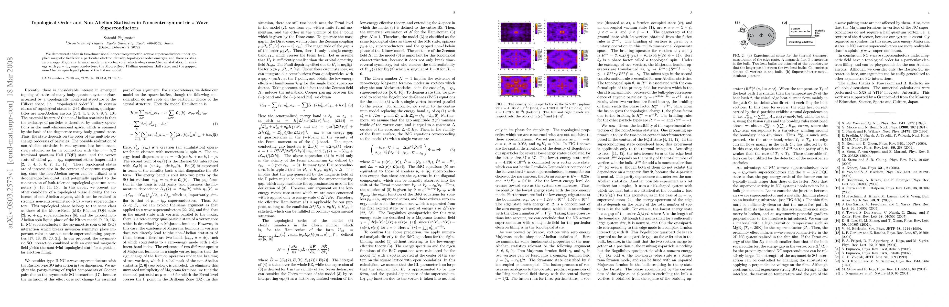 This paper reveals that two-dimensional noncentrosymmetric s-wave superconductors exhibit topological order and host zero energy Majorana fermion modes in vortex cores under specific conditions, demonstrating non-Abelian statistics akin to other topological quantum states.