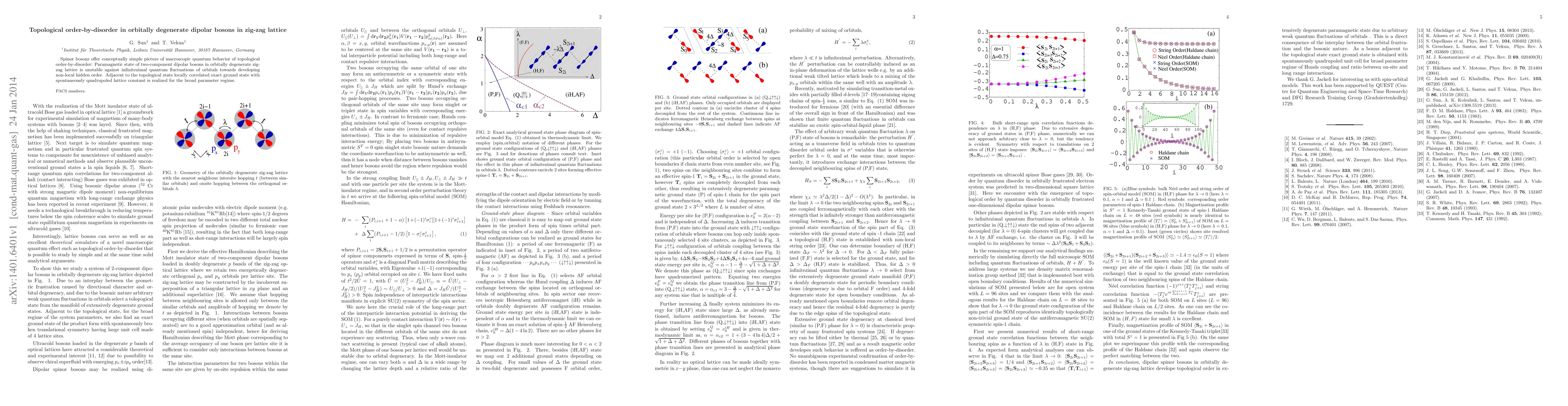 Summary: This paper explores the topological order-by-disorder phenomenon in orbitally degenerate dipolar spinor bosons in a zig-zag lattice, revealing that infinitesimal quantum fluctuations induce non-local hidden order, leading to a locally correlated exact ground state with a spontaneously quadrupoled lattice constant.