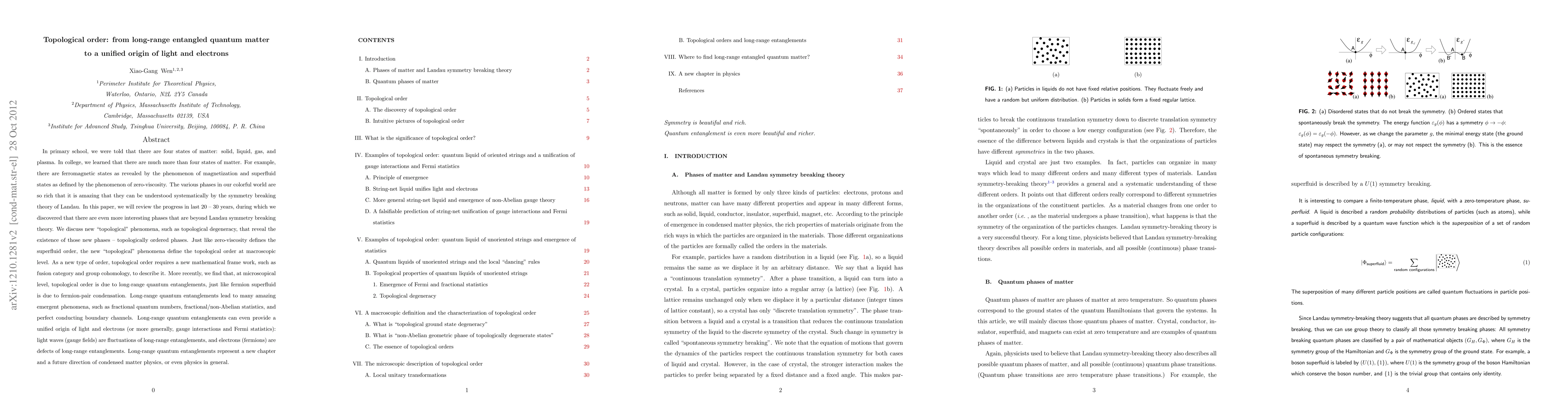 Researchers discovered a new type of order called topological order that arises from long-range quantum entanglements, unifying light and electrons in a single framework. This phenomenon leads to emergent properties like fractional quantum numbers and perfect conducting channels.