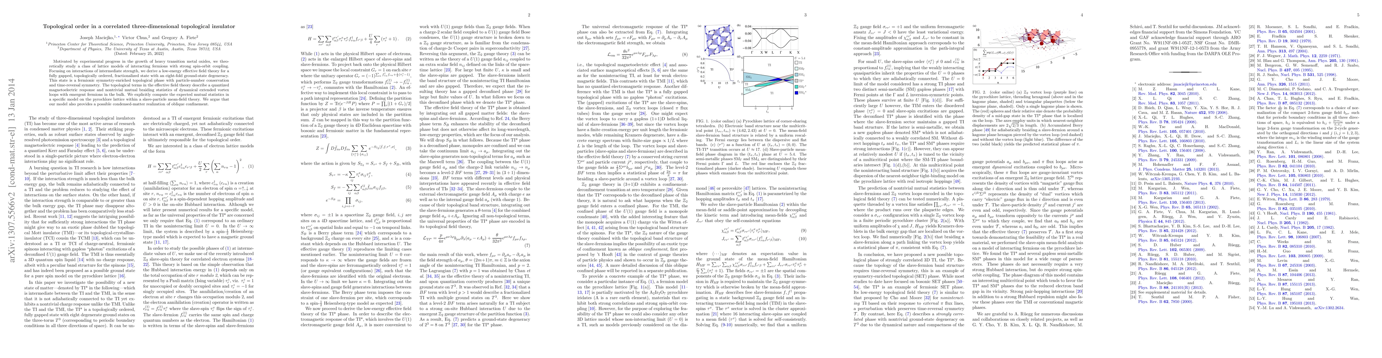 Motivated by experimental progress in the growth of heavy transition metal oxides, we theoretically study a class of lattice models of interacting fermions with strong spin-orbit coupling. Focusing on interactions of intermediate strength, we derive a low-energy effective field theory for a fully gapped, topologically ordered, fractionalized state with an eight-fold ground-state degeneracy. This state is a fermionic symmetry-enriched topological phase with particle-number conservation and time-reversal symmetry. The topological terms in the effective field theory describe a quantized magnetoelectric response and nontrivial mutual braiding statistics of dynamical extended vortex loops with emergent fermions in the bulk. We explicitly compute the expected mutual statistics in a specific model on the pyrochlore lattice within a slave-particle mean-field theory. We argue that our model also provides a possible condensed-matter realization of oblique confinement.