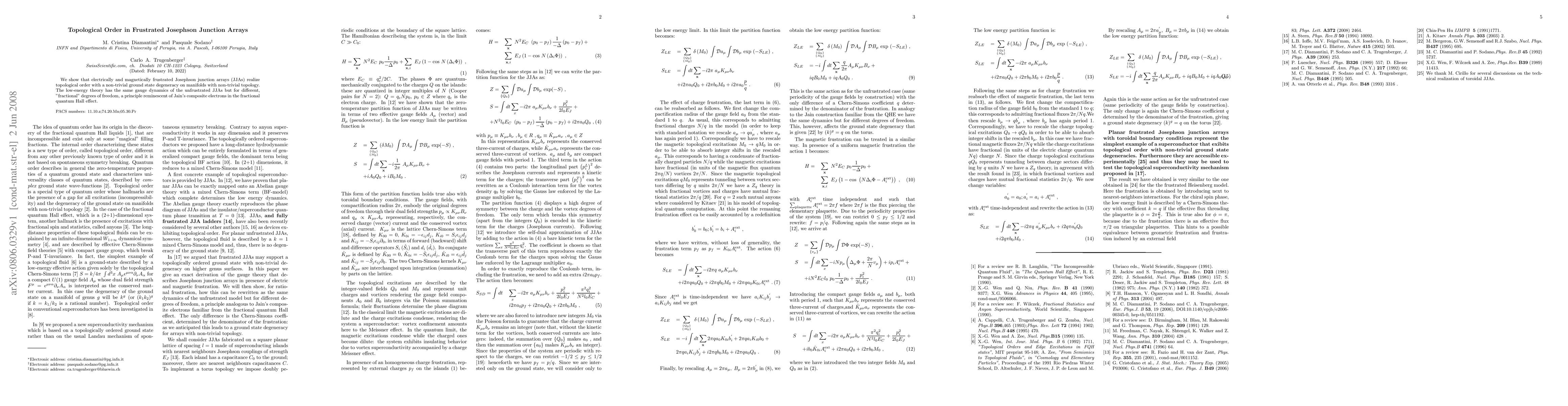 This paper demonstrates that electrically and magnetically frustrated Josephson junction arrays exhibit topological order, featuring a non-trivial ground state degeneracy on manifolds with complex topology, akin to fractional quantum Hall effect dynamics.