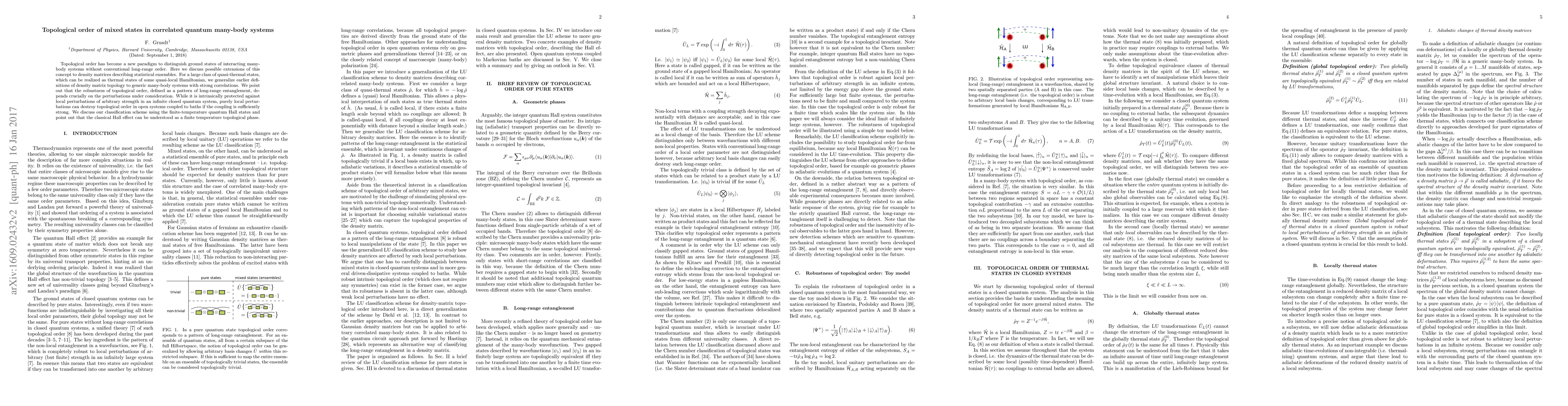 Topological order has become a new paradigm to distinguish ground states of interacting many-body systems without conventional long-range order. Here we discuss possible extensions of this concept to density matrices describing statistical ensembles. For a large class of quasi-thermal states, which can be realized as thermal states of some quasi-local Hamiltonian, we generalize earlier definitions of density matrix topology to generic many-body systems with strong correlations. We point out that the robustness of topological order, defined as a pattern of long-range entanglement, depends crucially on the perturbations under consideration. While it is intrinsically protected against local perturbations of arbitrary strength in an infinite closed quantum system, purely local perturbations can destroy topological order in open systems coupled to baths if the coupling is sufficiently strong. We discuss our classification scheme using the finite-temperature quantum Hall states and point out that the classical Hall effect can be understood as a finite temperature topological phase.