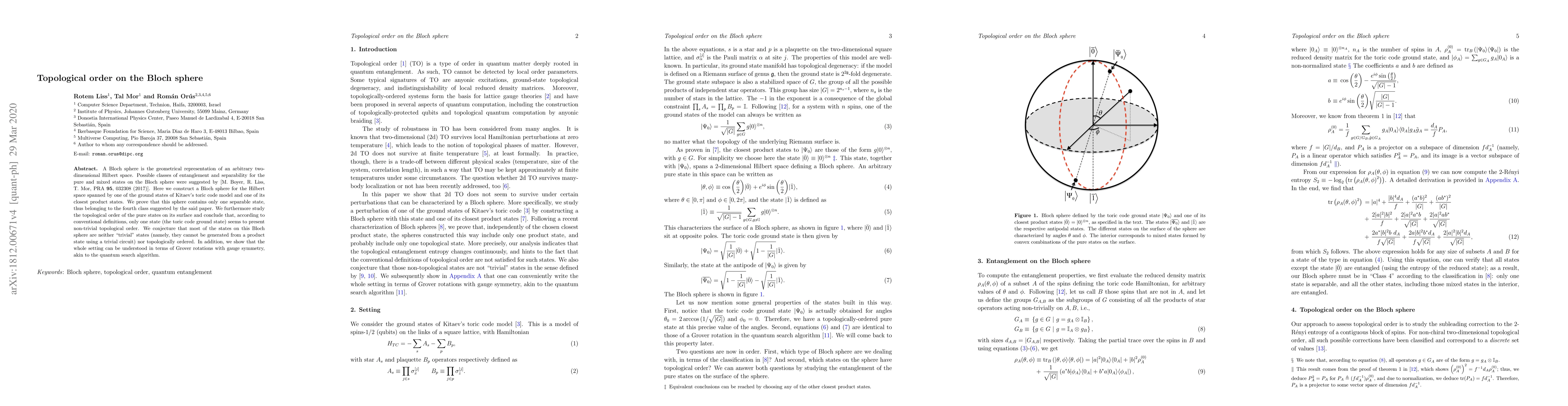 This paper constructs a Bloch sphere for the Hilbert space of Kitaev's toric code model, proving it contains only one separable state and identifying one state with non-trivial topological order. The authors conjecture that most states are neither trivial nor topologically ordered, and relate the setting to Grover rotations with gauge symmetry.