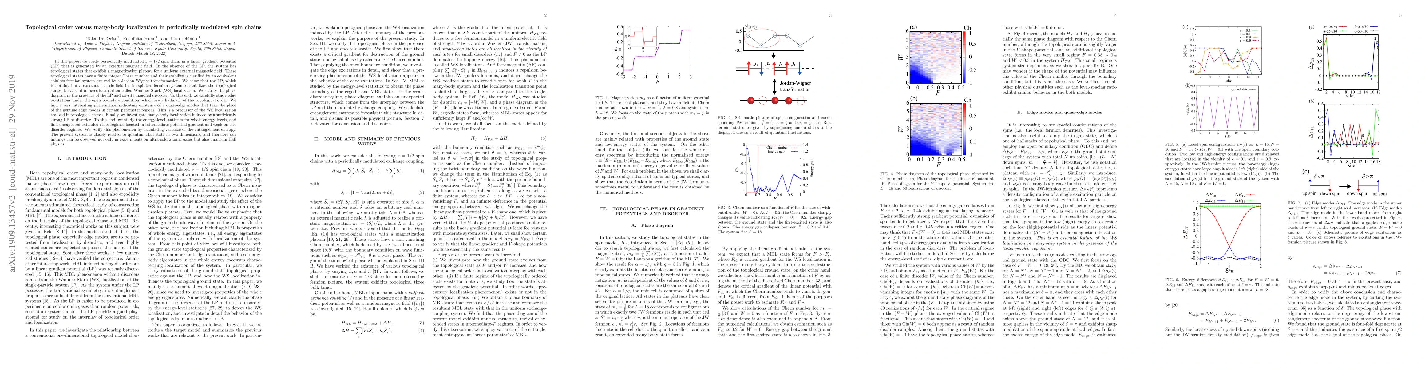 In this paper, we study periodically modulated $s=1/2$ spin chain in a linear gradient potential (LP) that is generated by an external magnetic field. In the absence of the LP, the system has topological states that exhibit a magnetization plateau for a uniform external magnetic field. These topological states have a finite integer Chern number and their stability is clarified by an equivalent spinless fermion system derived by a Jordan-Wigner transformation. We show that the LP, which is nothing but a constant electric field in the spinless fermion system, destabilizes the topological states, because it induces localization called Wannier-Stark (WS) localization. We clarify the phase diagram in the presence of the LP and on-site diagonal disorder. To this end, we carefully study edge excitations under the open boundary condition, which are a hallmark of the topological order. We find a very interesting phenomenon indicating existence of a quasi-edge modes that take the place of the genuine edge modes in certain parameter regions. This is a precursor of the WS localization realized in topological states. Finally, we investigate many-body localization induced by a sufficiently strong LP or disorder. To this end, we study the energy-level statistics for whole energy levels, and find unexpected extended-state regimes located in intermediate potential-gradient and weak on-site disorder regimes. We verify this phenomenon by calculating variance of the entanglement entropy. The present system is closely related to quantum Hall state in two dimensions, and therefore our findings can be observed not only in experiments on ultra-cold atomic gases but also quantum Hall physics.