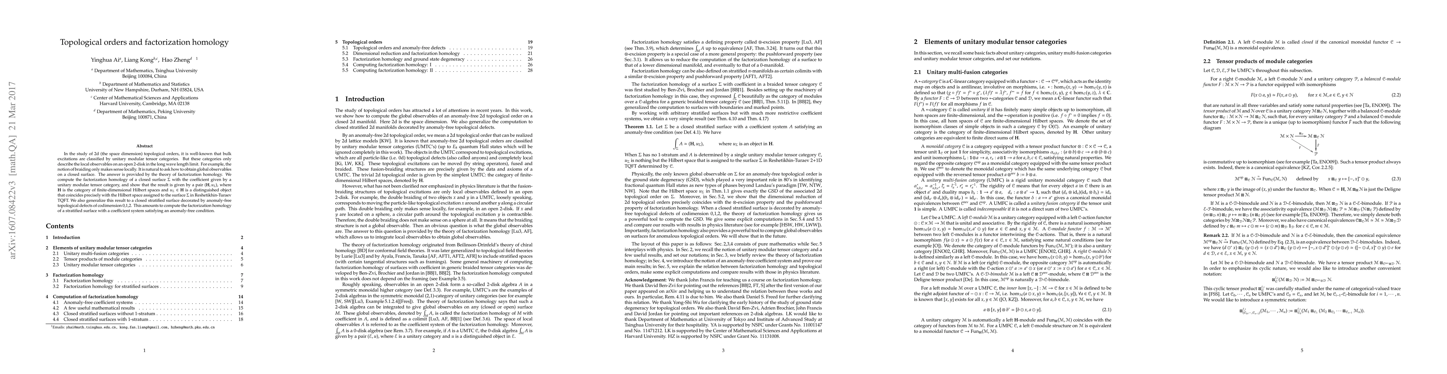 This paper explores the connection between 2D topological orders and factorization homology, showing that global observables on closed surfaces are computed via factorization homology with coefficients in a unitary modular tensor category, yielding a pair involving the category of finite-dimensional Hilbert spaces and a distinguished object. It extends these findings to stratified surfaces with anomaly-free topological defects.