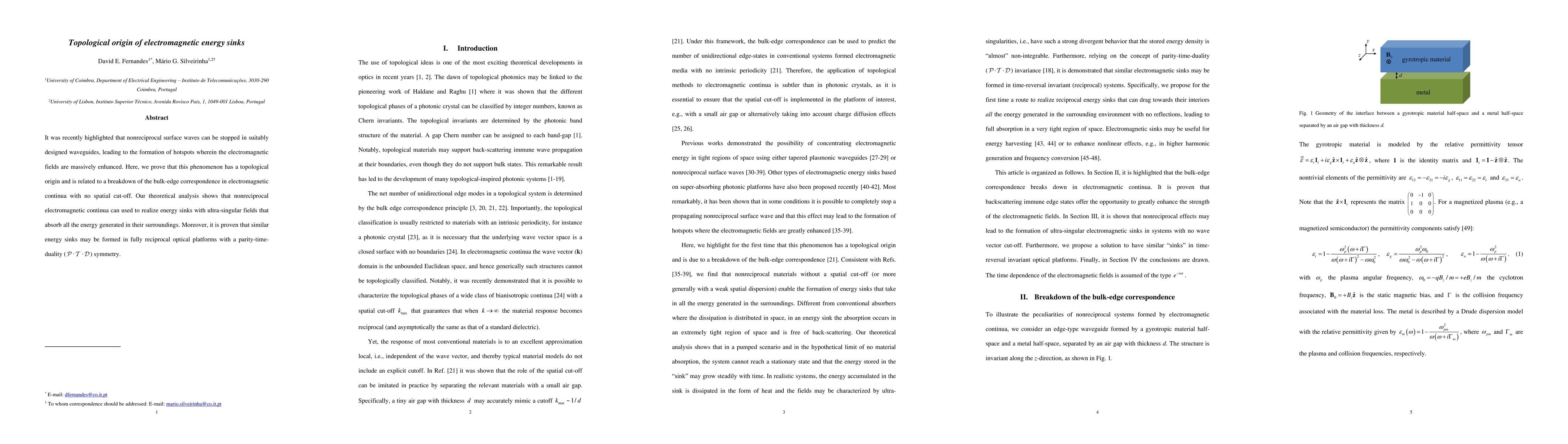 It was recently highlighted that nonreciprocal surface waves can be stopped in suitably designed waveguides, leading to the formation of hotspots wherein the electromagnetic fields are massively enhanced. Here, we prove that this phenomenon has a topological origin and is related to a breakdown of the bulk-edge correspondence in electromagnetic continua with no spatial cut-off. Our theoretical analysis shows that nonreciprocal electromagnetic continua can used to realize energy sinks with ultra-singular fields that absorb all the energy generated in their surroundings. Moreover, it is proven that similar energy sinks may be formed in fully reciprocal optical platforms with a parity-time-duality (P-T-D) symmetry.