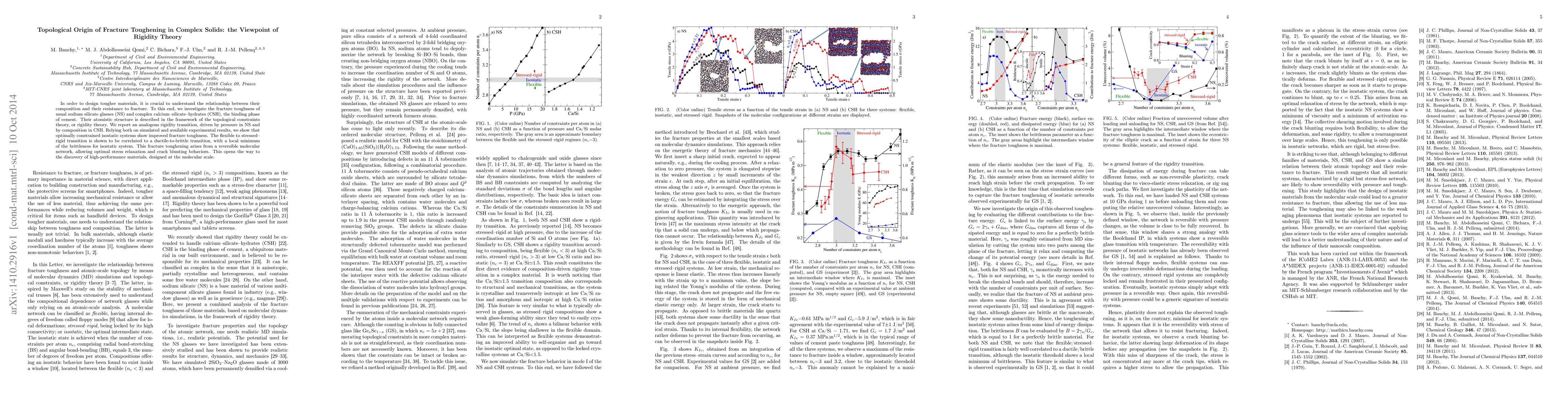 In order to design tougher materials, it is crucial to understand the relationship between their composition and their resistance to fracture. To this end, we investigate the fracture toughness of usual sodium silicate glasses (NS) and complex calcium--silicate--hydrates (CSH), the binding phase of cement. Their atomistic structure is described in the framework of the topological constraints theory, or rigidity theory. We report an analogous rigidity transition, driven by pressure in NS and by composition in CSH. Relying both on simulated and available experimental results, we show that optimally constrained isostatic systems show improved fracture toughness. The flexible to stressed--rigid transition is shown to be correlated to a ductile-to-brittle transition, with a local minimum of the brittleness for isostatic system. This fracture toughening arises from a reversible molecular network, allowing optimal stress relaxation and crack blunting behaviors. This opens the way to the discovery of high-performance materials, designed at the molecular scale.