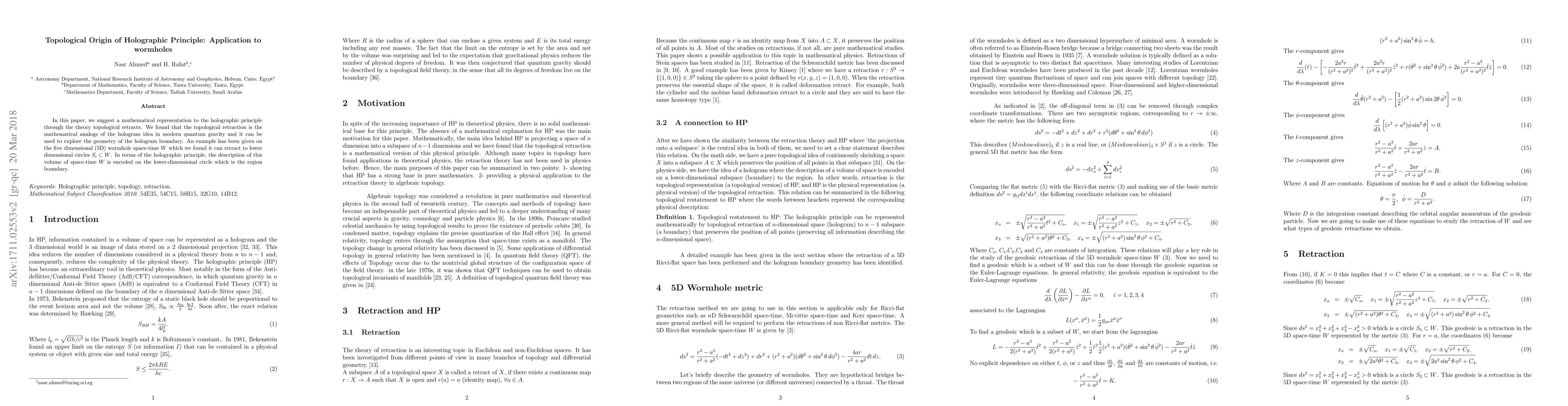 In this paper, we suggest a mathematical representation to the holographic principle through the theory topological retracts. We found that the topological retraction is the mathematical analogs of the hologram idea in modern quantum gravity and it can be used to explore the geometry of the hologram boundary. An example has been given on the five dimensional (5D) wormhole space-time $W$ which we found it can retract to lower dimensional circles $S_i \subset W$. In terms of the holographic principle, the description of this volume of space-time $W$ is encoded on the lower-dimensional circle which is the region boundary.