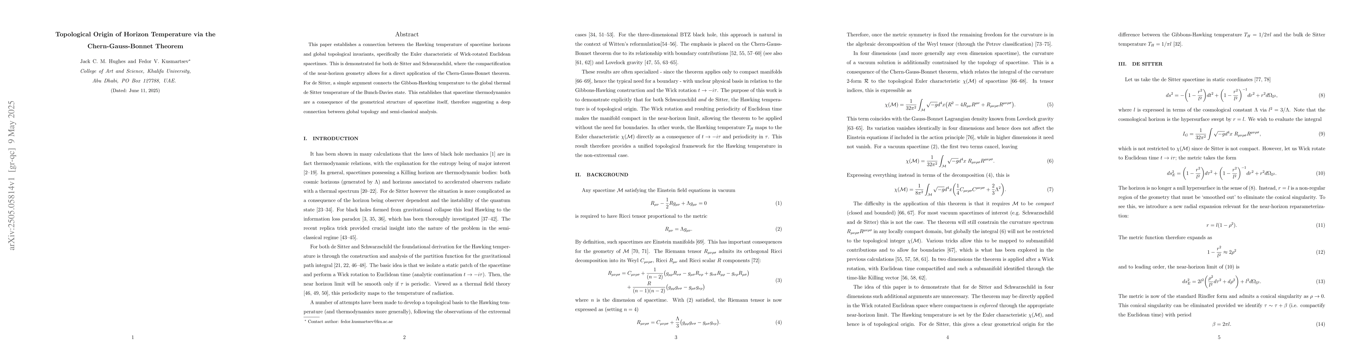 The paper employs the Chern-Gauss-Bonnet theorem to connect the Hawking temperature of spacetime horizons with topological invariants, specifically the Euler characteristic of Wick-rotated Euclidean spacetimes, demonstrating this for de Sitter and Schwarzschild cases.